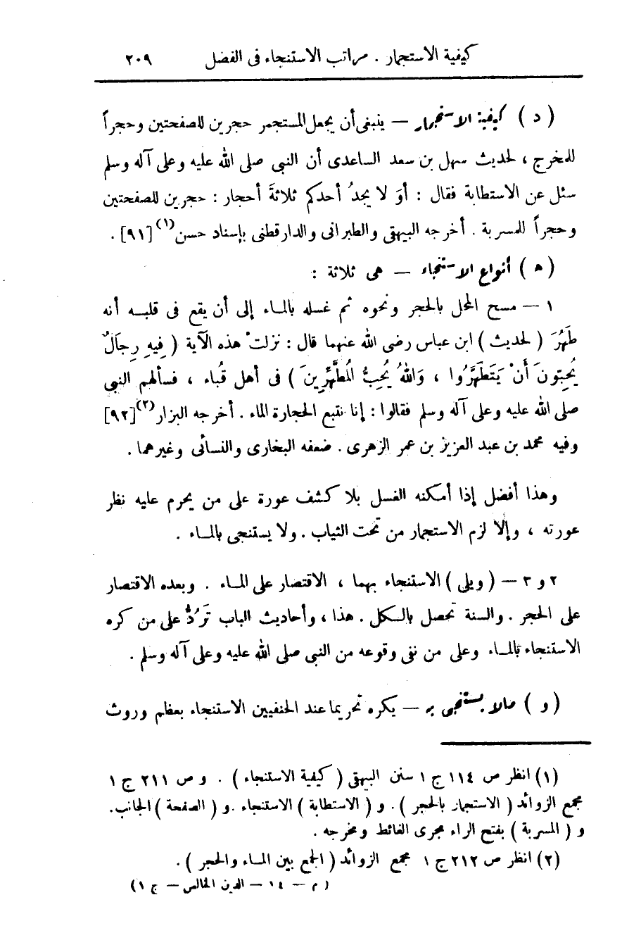 (¬2) انظر ص 212 ج 1 مجمع الزوائد (الجمع بين الماء والحجر).