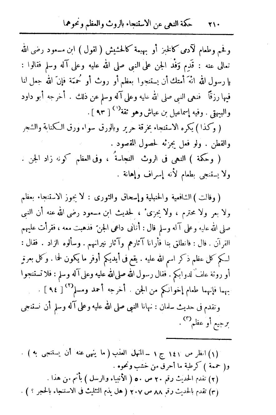 (وقالت) الشافعية والحنبلية وإسحاق والثوري: لا يجوز الاستنجاء بعظم ولا بعر ولا محترم، ولا يجزئ، لحديث ابن مسعود رضي الله عنه أن النبي صلى الله عليه وعلى آله وسلم قال: أتاني داعي الجن فذهبت معه، فقرأت عليهم القرآن. قال: فانطلق بنا فأرانا آثارهم وآثار نيرانهم. وسألوه الزاد. فقال: لكم كل عظم ذكر اسم الله عليه. يقع في أيديكم أوفر ما يكون لحما. وكل بعرة أو رويثة علف لدوابكم. فقال رسول الله صلى الله عليه وعلى آله وسلم: فلا تستنجوا بهما فإنهما طعام أخوانكم من الجن. أخرجه أحمد ومسلم (¬2) {94}.