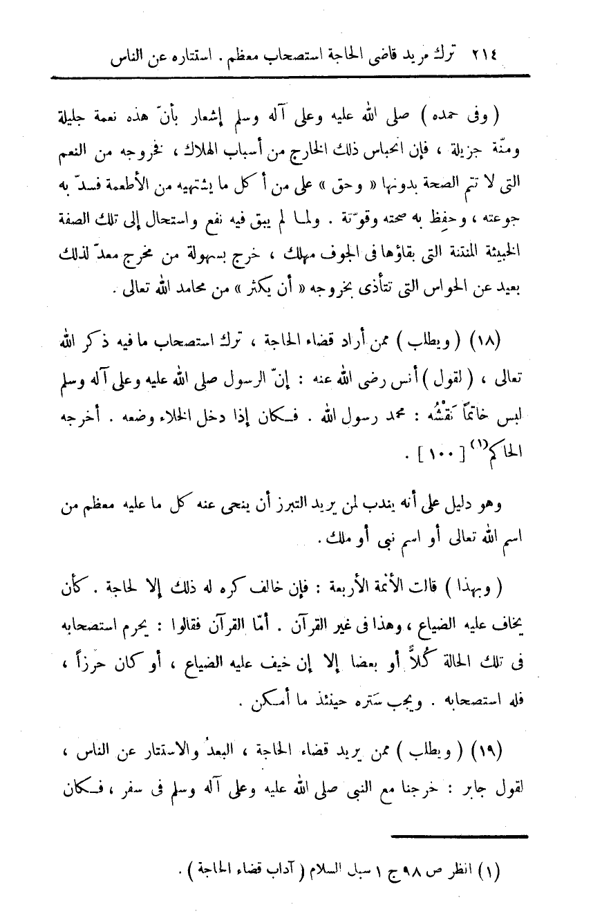 18 - (ويطلب) ممن أراد قضاء الحاجة، ترك استصحاب مافيه ذكر الله تعالى، (لقول) أنس رضي الله عنه: إن الرسول صلى الله عليه وعلى آله وسلم لبس خاتما نقشه: محمد رسول الله. فكان إذا دخل الخلاء وضعه. أخرجه الحاكم (¬1) {100}.
