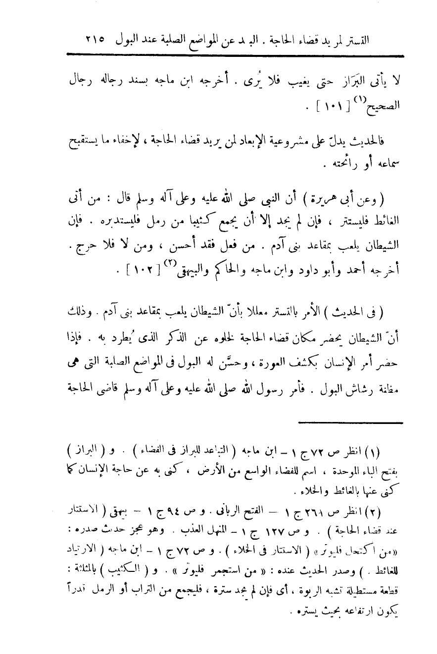 (¬1) انظر ص 72 ج 1 ابن ماجه (التباعد للبراز في القضاء). و (البراز) بفتح الباء الموحدة، اسم للفضاء الواسع من الأرض، كني به عن حاجة الإنسان كما كنى عنها بالغائط والخلاء.