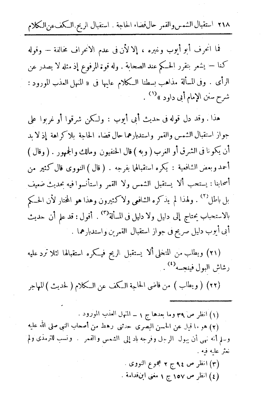 هذا. وقد دل قوله في حديث أبي أيوب: ولكن شرقوا أو غربوا على جواز استقبال الشمس والقمر واستدبارهما حال قضاء الحاجة بلا كراهة إذ لابد أن يكونا في الشرق أو الغرب (وبه) قال الحنفيون ومالك والجمهور. (وقال) أحمد وبعض الشافعية: يكره استقبالهما بفرجه. (قال) النووي قال كثير من أصحابنا: يستحب ألا يستقبل الشمس ولا القمر واستأنسوا به بحديث ضعيف بل باطل (¬2) ولهذا لم يذكره الشافعي ولا كثيرون وهذا هو المختار لأن الحكم بالاستحباب يحتاج إلى دليل ولا دليل في المسألة (¬3). أقول: قد علم أن حديث أبي أيوب دليل صريح في جواز استقبال القمرين واستدبارهما.