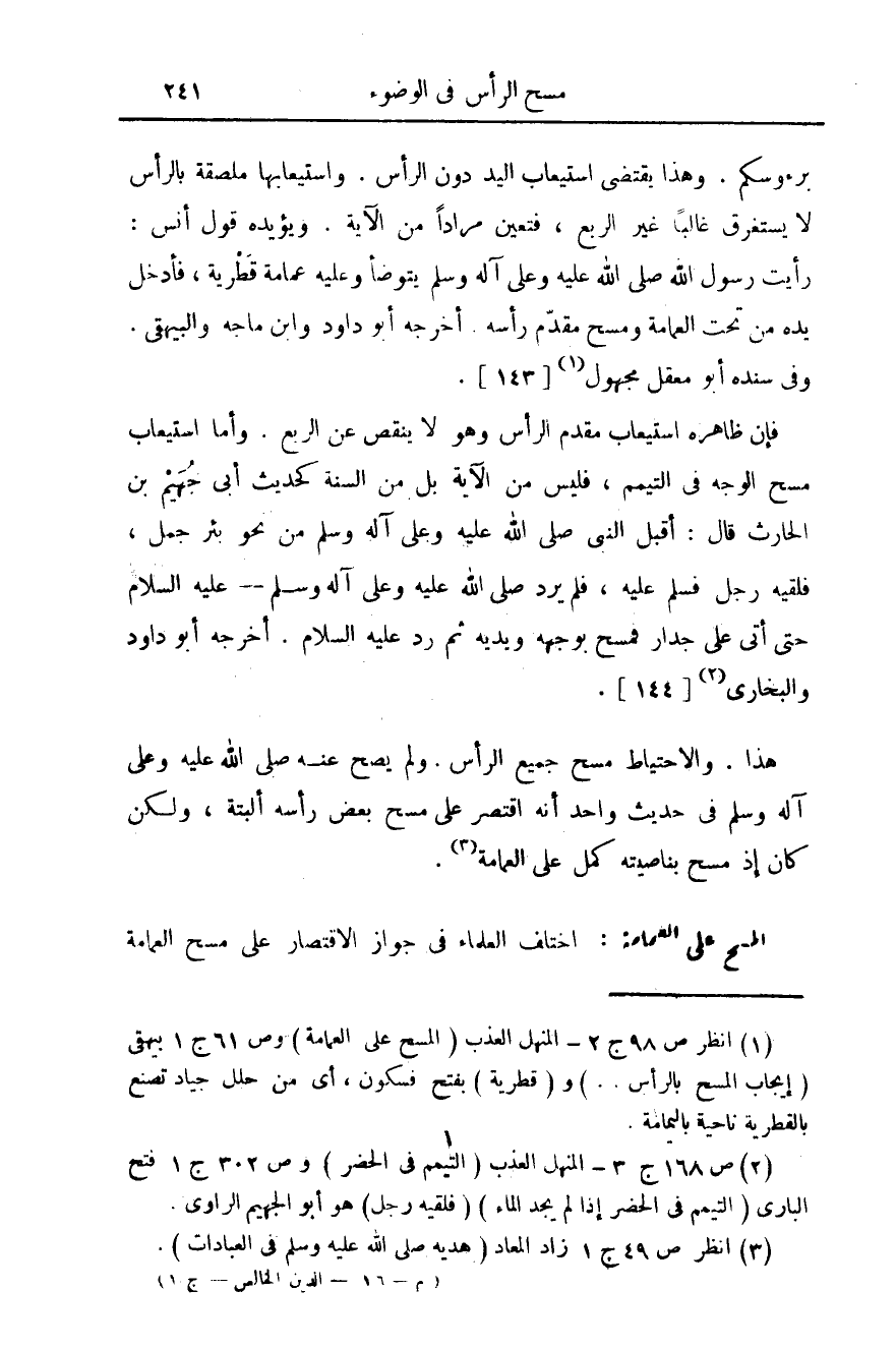 (¬1) انظر ص 98 ج 2 - المنهل العذب (المسح على العمامة) وص 61 ج 1 بيهقي (إيجاب المسح بالرأس .. ) و (قطرية) بفتح فسكون، أي من حلل جياد تصنع بالقطرية ناحية اليمامة.