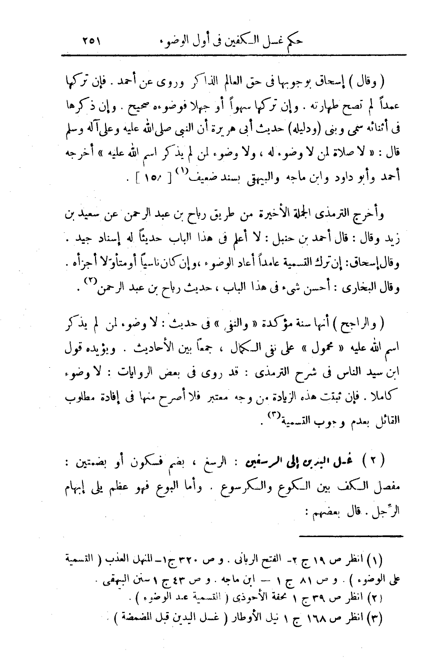 (¬1) انظر ص 19 ج 2 - الفتح الرباني. وص 320 ج 1 - المنهل العذب (التسمية على الوضوء). وص 81 ج 1 - ابن ماجه. وص 43 ج 1 سنن البيهقي.