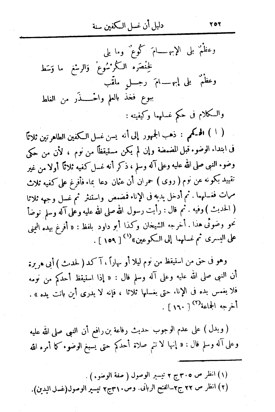 ... وهو في حق من استيقظ من نوم ليلا أو نهارا، أكد (لحديث) أبي هريرة أن النبي صلى الله عليه وعلى آله وسلم قل: "إذا استيقظ أحدكم من نومه فلا يغمس يده في الإناء حتى يغسلها ثلاثا، فإنه لا يدري أين باتت يده". أخرجه الجماعة (¬2) [160].