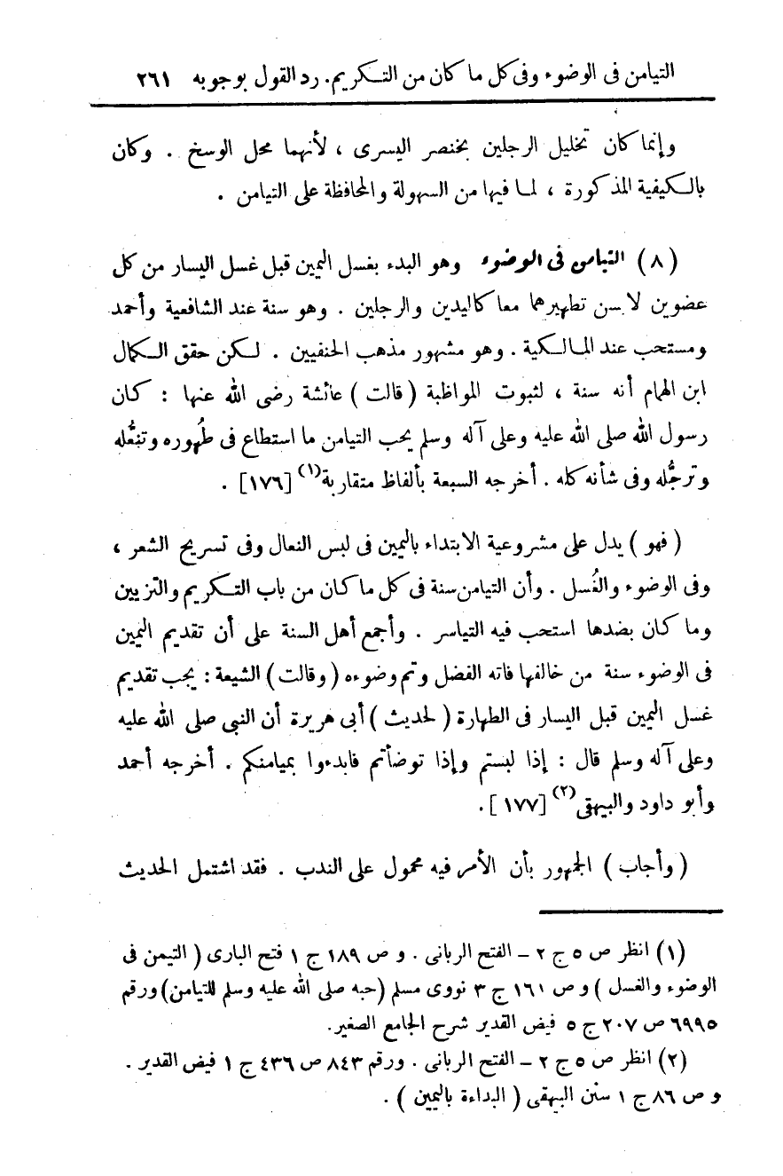 (¬1) ص 5 ج 2 - الفتح الرباني. وص 189 ج 1 فتح الباري (التيمن في الوضوء والغسل) وص 161 ج 3 نووي مسلم (حبه صلى الله عليه وسلم للتيامن) ورقم 6995 ص 207 ج 5 فيض القدير شرح الجامع الصغير.
