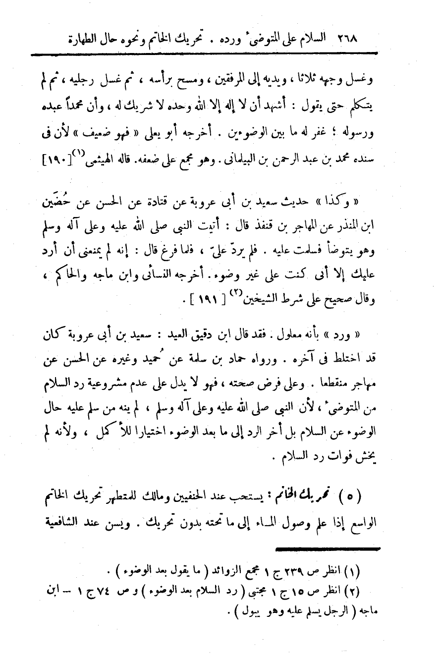 "ورد" بأنه معلول. فقد قال ابن دقيق العيد: سعيد بن أبي عروبة كان قد اختلط في آخره. ورواه حماد بن سلمة عن حميد وغيره عن الحسن عن مهاجر منقطعا. وعلى فرض صحته، فهو لا يدل على عدم مشروعية رد السلام من المتوضئ، لأن النبي صلى الله عليه وعلى آله وسلم، لم ينه من سلم عليه حال الوضوء عن السلام بل أخر الرد على ما بعد الوضوء اختيارا للأكمل، ولأنه لم يخش فوات رد السلام.