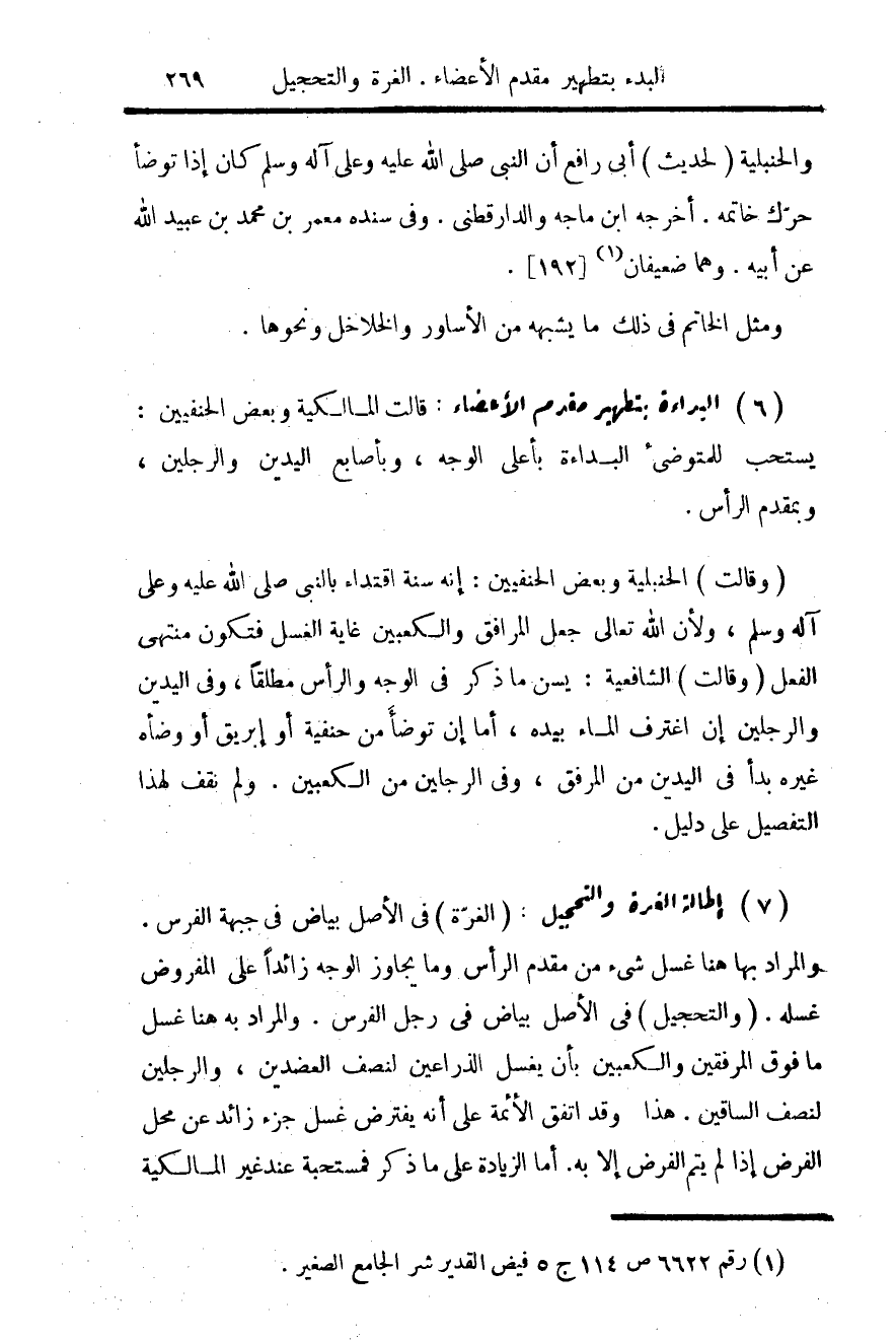 7 - إطالة الغرة والتحجيل: (الغرة) في الأصل بياض في جبهة الفرس. والمراد بها هنا غسل شيء من مقدم الرأس وما يجاوز الوجه زائدا على المفروض غسله. (والتحجيل) في الأصل بياض في رجل الفرس. والمراد به هنا غسل ما فوق المرفقين والكعبين بان يغسل الذراعين لنصف العضدين، والرجلين لنصف الساقين. هذا. وقد اتفق الأئمة على أنه يفترض غسل جزء زائد من محل الفرض إذا لم يتم الفرض إلا به. أما الزيادة على ما ذكر فمستحبة عند غير المالكية