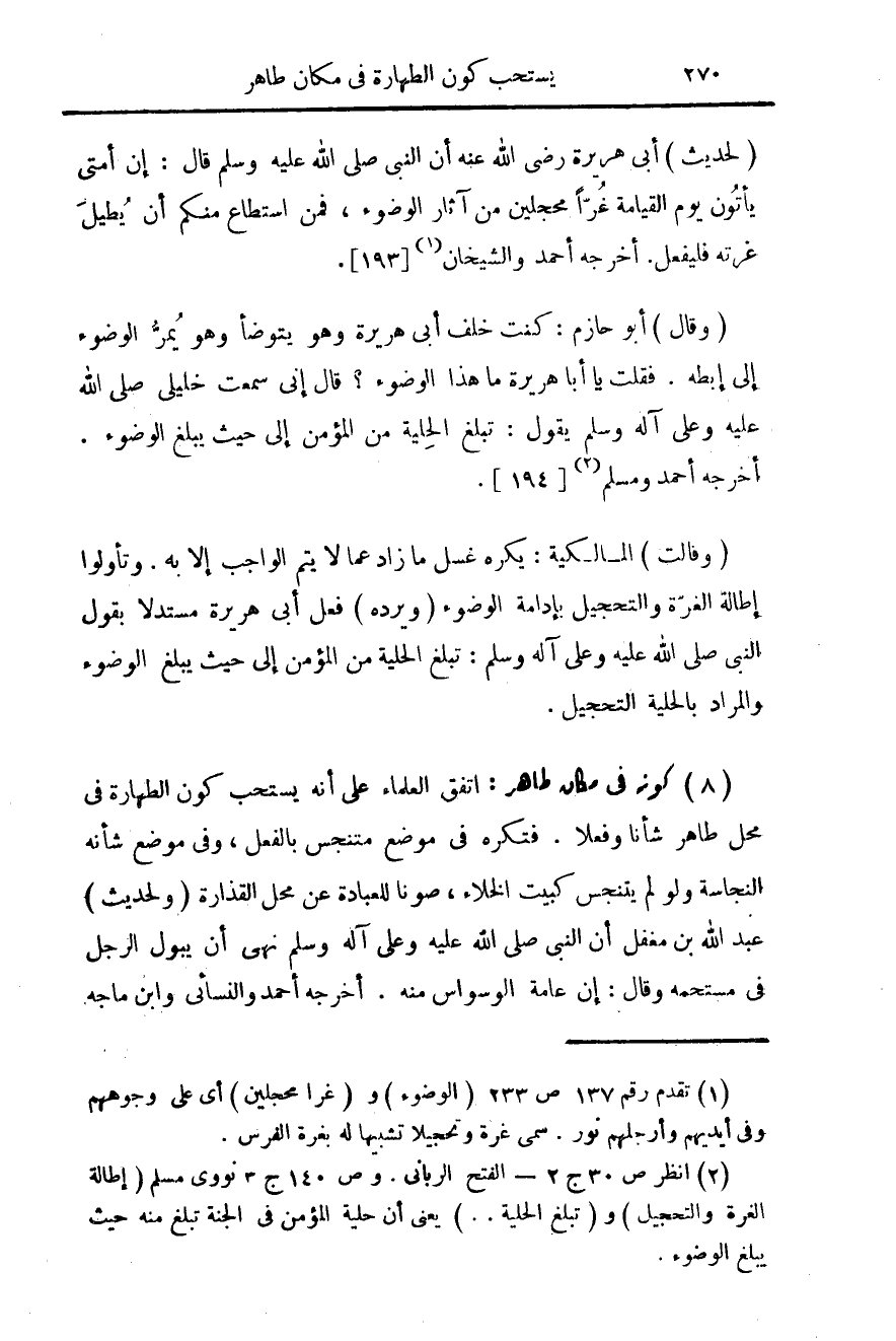 (¬2) انظر ص 30 ج 2 - الفتح الرباني. ص 140 ج 3 نووي مسلم (إطالة الغرة والتحجيل) و (تبلغ الحلية .. ) يعني أن حلية المؤمن في الجنة تبلغ منه حيث يبلغ الوضوء.