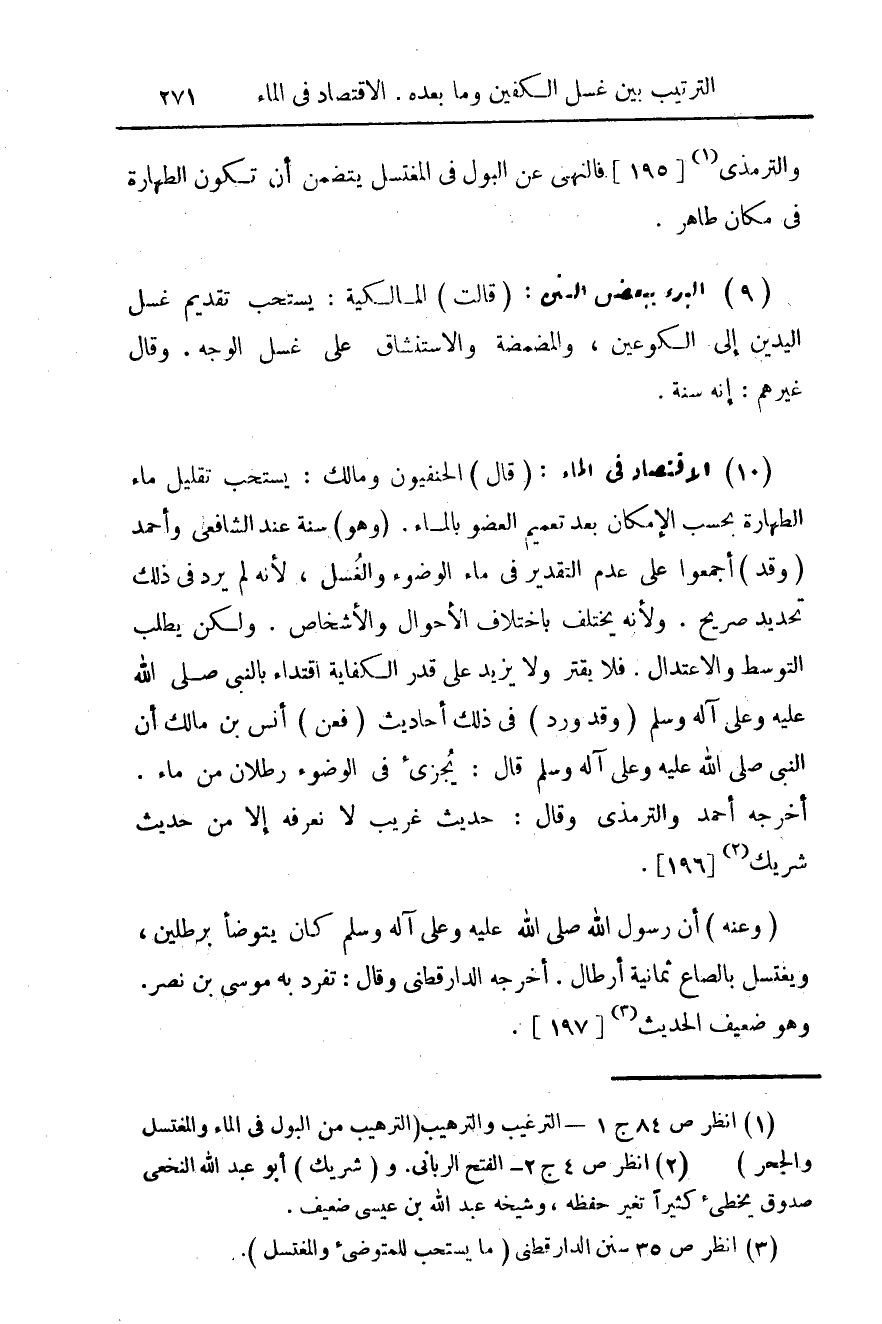 10 - الاقتصاد في الماء: (قال) الحنفيون ومالك: يستحب تقليل ماء الطهارة بحسب الأماكن بعد تعميم العضو بالماء. (وهو) سنة عند الشافعي وأحمد (وقد) أجمعوا على عدم التقدير في ماء الوضوء والغسل، لأنه لم يرد في ذلك تحديد صريح. ولأنه يختلف باختلاف الأحوال والأشخاص. ولكن يطلب التوسط والاعتدال. فلا يقتر ولا يزيد على قدر الكفاية اقتداء بالنبي صلى الله عليه وعلى آله وسلم (وقد ورد) في ذلك أحاديث (فعن) أنس بن مالك أن النبي صلى الله وعلى آله وسلم قال: يجزئ في الوضوء رطلان من ماء. أخرجه أحمد والترمذي وقال: حديث غريب لا نعرفه إلا من حديث شريك (¬2) [196].
