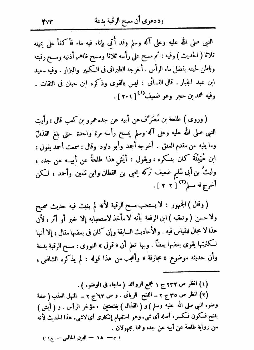 (وقال) الجمهور: لا يستحب مسح الرقبة لأنه لم يثبت فيه حديث صحيح ولا حسن (وتعقبه) ابن الرفعة بأن لا مأخذ لاستحبابه إلا خبر أو أثر، لأن هذا لا مجال للقياس فيه. والأحاديث السابقة وإن كان في بعضها مقال، إلا أنها لكثرتها يقوي بعضها بعضا. وبها تعلم أن "قول" النووي: مسح الرقبة بدعة وأن حديثه موضوع "مجازفة" وأعجب من هذا قوله: لم يذكره الشافعي،
