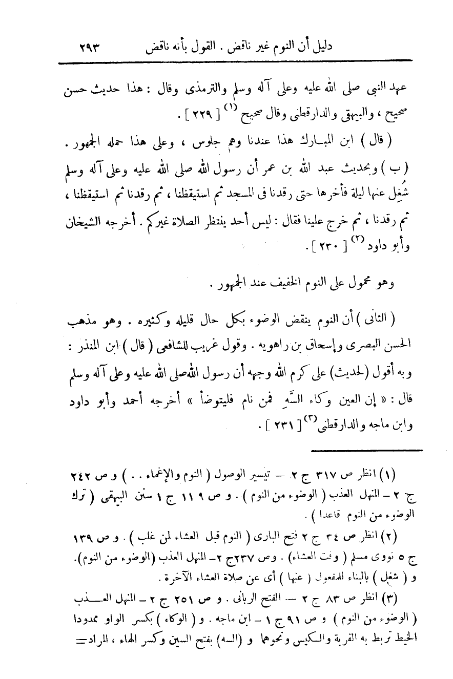 (¬1) انظر ص 317 ج 2 - تيسير الوصول (النوم والإغماء .. ) وص 242 ج 2 - المنهل العذب (الوضوء من النوم). وص 119 ج 1 سنن البيهقي (ترك الوضوء من النوم قاعدا).