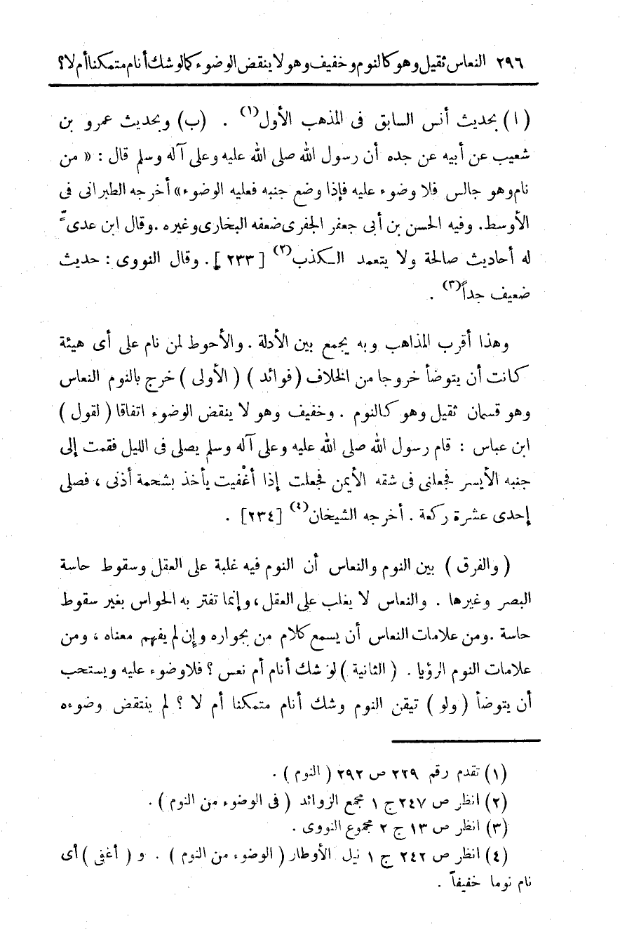 (ب) وبحديث عمرو بن شعيب عن أبيه عن جده أن رسول الله صلى الله عليه وعلى آله وسلم قال: "من نام وهو جالس فلا وضوء عليه فغذا وضع جنبه فعليه الوضوء". أخرجه الطبراني في الأوسط. وفيه الحسن بن أبي جعفر الجفري ضعفه البخاري وغيره. وقال ابن عدى له أحاديث صالحة ولا يتعمد الكذب (¬2) [233].
