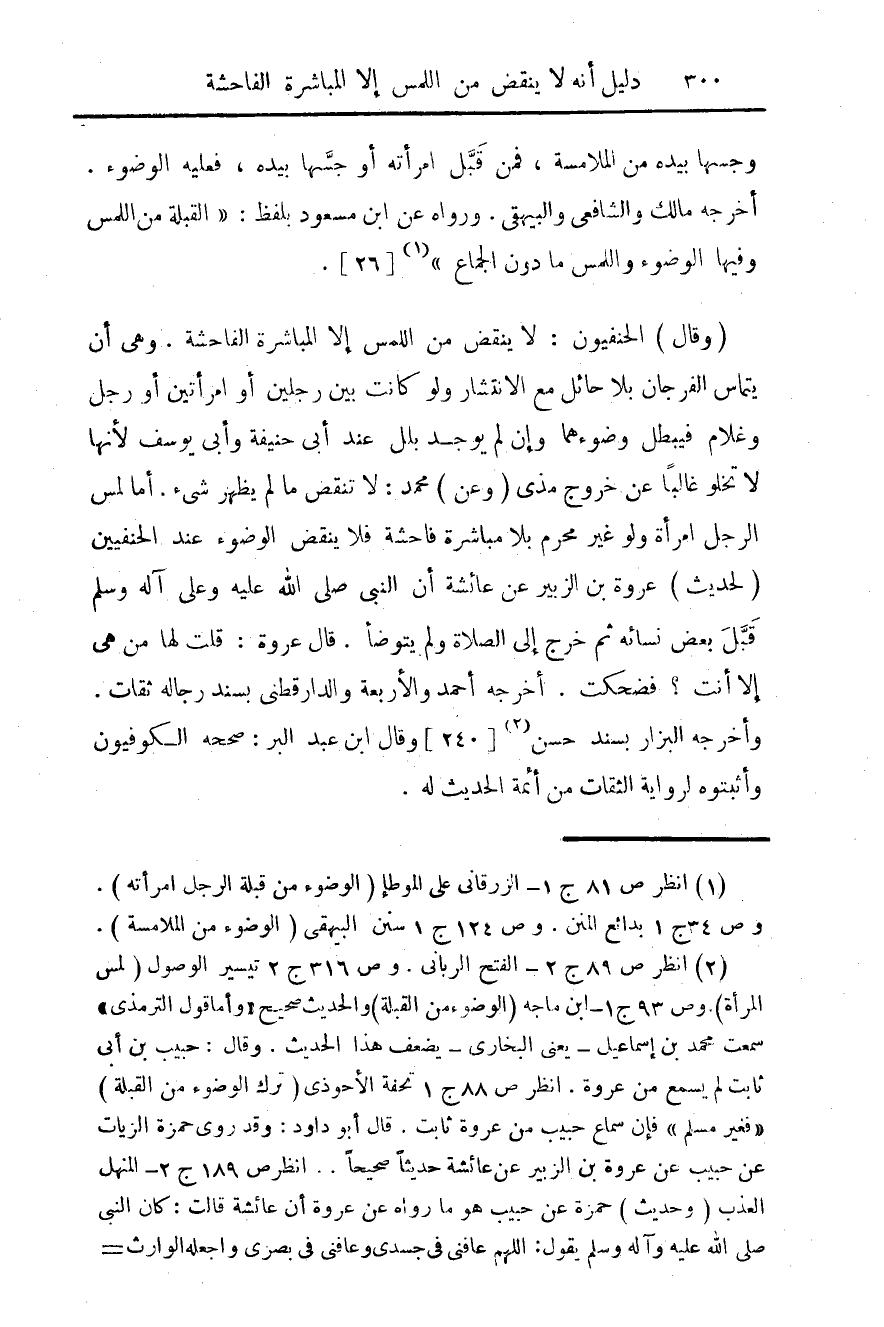 (وقال) الحنفيون: لا ينقض من اللمس إلا المباشرة الفاحشة. وهي أن يتماس الفرجان بلا حائل مع الانتشار ولو كانت بين رجلين أو امرأتين أو رجل وغلام فيبطل وضوءهما وإن لم يوجد بلل عند أبي حنيفة وابي يوسف لأنها لا تخلوا غالبا عن خروج مذي (وعن) محمد: لا تنقص ما لم يظهر شيء. أما لمس الرجل امرأة ولو غير محرم بلا مباشرة قاحشة فلا ينقض الوضوء عند الحنفيين (لحديث) عروة بن الزبير عن عائشة أن النبي صلى الله وعلى آله وسلم قبل بعض نسائه ثم خرج إلى الصلاة ولم يتوضأ. قال عروة: قلت لها من هي إلا أنت؟ فضحكت. أخرجه أحمد والأربعة والدارقطني بسند رجاله ثقات. وأخرجه الزار بسند حسن (¬2) [240].