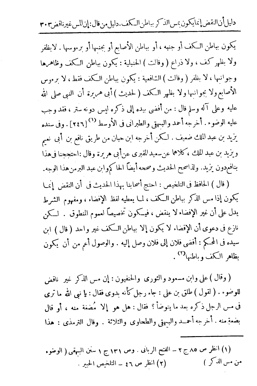 (¬1) انظر ص 85 ج 2 - الفتح الرباني. وص 131 ج 1 سنن البيهقي (الالوضوء من مس الذكر).