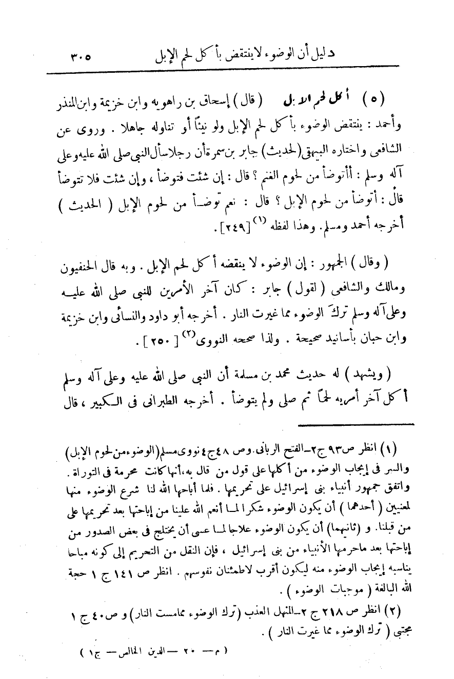 5 - أكل لحم الإبل: (قال) إسحاق بن راهويه وابن خزيمة وابن المنذر وأحمد: ينتقض الوضوء بأكل لحم الإبل ولو نيئا أو تناوله جاهلا. وروى عن الشافعي واختاره البيهقي (لحديث) جابر بن سمرة أن رجلا سأل النبي صلى الله عليه وعلى ىله وسلم: أأتوضأ من لحوم الغنم؟ قال: إن شئت فتعوضأت، وإن شئت فلا تتوضأ قال: أتوضأ من لحوم الإبل؟ قال: نعم توضأ من لحوم الإبل (الحديث). أخرجه أحمد ومسلم. وهذا لفظه (¬1) [249].