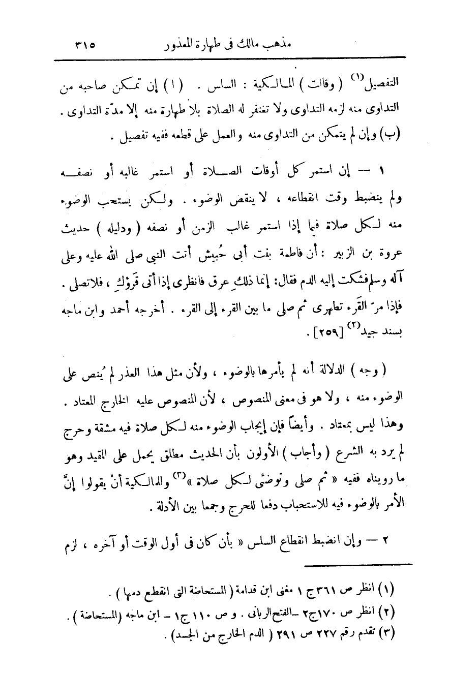 1 - إن استمر كل أقوات الصلاة أو استمر غالبه أو نصفه ولم ينضبط وقت انقطاعه، لا ينقض الوضوء. ولكن يستحب الوضوء منه لكل صلاة فيما إذا استمر غالب الزمن أو نصفه (ودليله) حديث عروة ابن الزبير: أن فاطمة بنت أبي حبيش أتت النبي صلى الله عليه وعلى آله وسلم فشكت إليه الدم فقال: إنما ذلك عرق فانظري إذا اتى قرؤك فلا تصلي. فإذا مر القرء تطهري ثم صلي ما بين القرء إلى القرء. أخرجه أحمد وابن ماجه بسند جيد (¬2) {259}.