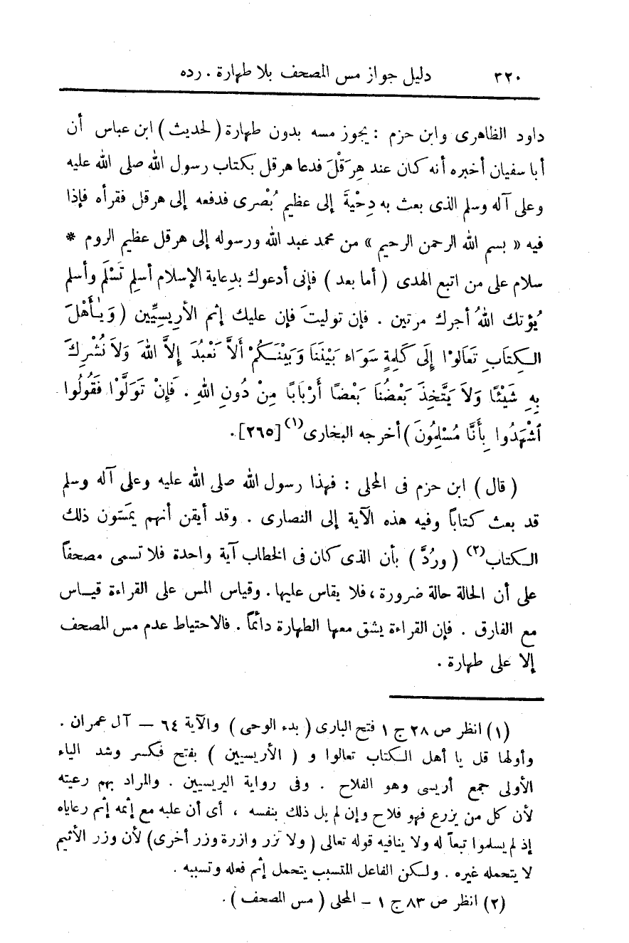 داود الظاهري وابن حزم: يجوز مسه بدون طهارة (لحديث) ابن عباس أن أبا سفيان أخبره أنه كان عند هرقل فدعا هرقل بكتاب رسول الله صلى الله عليه وعلى آله وسلم الذي بعث به دحية إلى عظيم بصري فدفعه إلى هرقلف فقرأه فإذا فيه "بسم الله الرحمن الرحيم" من محمد عبد الله ورسوله إلى هرقل عظيم الروم* سلام على من اتبع الهدى (أما بعد) فإني أدعوك بدعاية الإلام أسلم تسلم وأسلم يؤتك الله أجرك مرتين. فإن توليت فإن عليك أثم الاريسيين (ويأهل الكتاب تعالوا إلى كلمة سواء بيننا وبينكم إلا نعبد إلا الله ولا نشرك به شيئا ولا يتخذ بعضا بعضا أربابا من دون الله. فإن تولوا فقولوا أشهدوا بأنا مسلمون). أخرجه البخاري (¬1) {