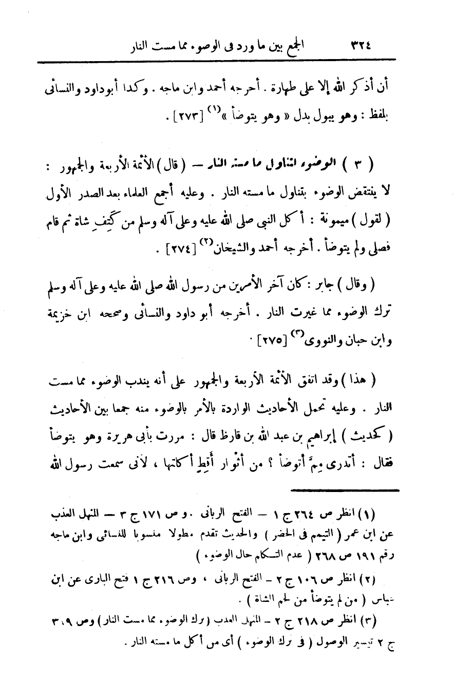 (¬3) انظر ص 218 ج 2 - المنهل العذب (ترك الوضوء مما مست النار) وص 319 ج 2 تيسير الوصول (في ترك الوضوء) أي من أكل ما مسته النار.