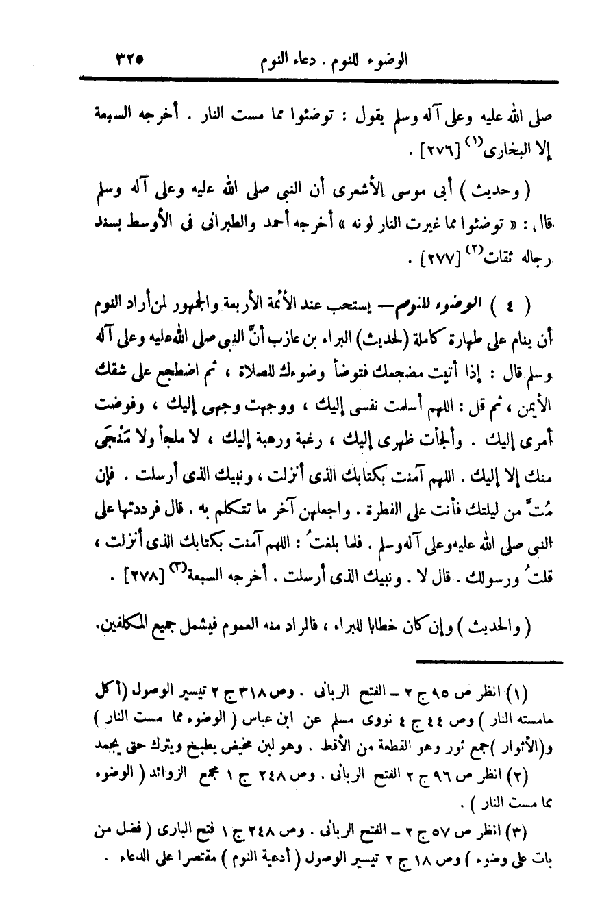 (¬3) انظر ص 57 ج 2 - الفتح الرباني. وص 248 ج 1 فتح الباري (فضل من بات على وضوء) وص 18 ج 2 تيسير الوصول (أدعية النوم) مقتصرا على الدعاء.