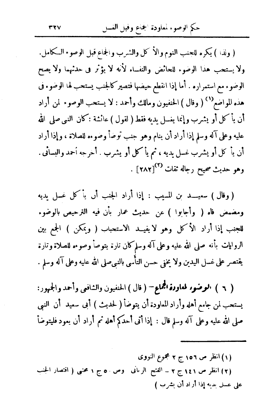 6 - الوضوء لمعاودة الجماع- (قال) الحنفيون والشافعي وأحمد والجمهور: يستحب لمن جامع أهله واراد المعاودة أن يتوضأ (لحديث) أبي سعيد أن النبي صلى الله عليه وعلى آله وسلم قال: إذا أتى أحدكم أهله ثم أراد أن يعود فليتوضأ