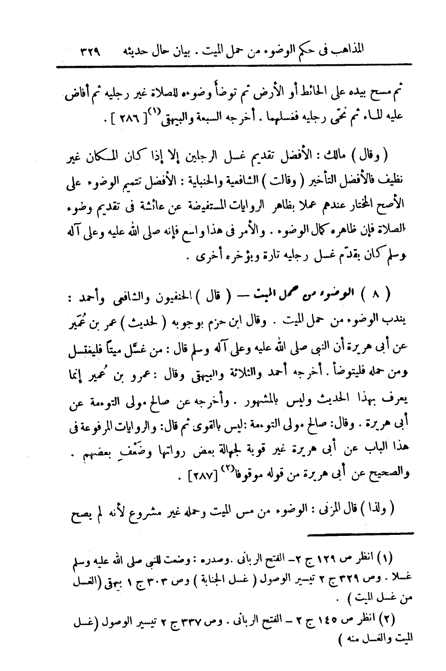 (¬2) انظر ص 145 ج 2 - الفتح الرباني. وص 337 ج 2 تيسير الوصول (غسل الميت والغسل منه).