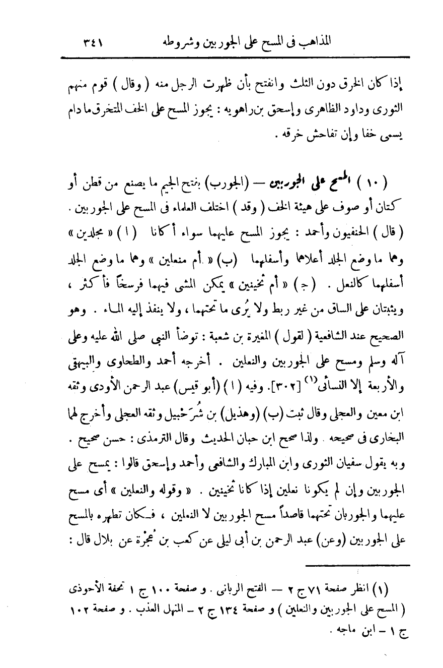 (¬1) انظر ص 71 ج 2 - الفتح الرباني. وص 100 ج 1 تحفة الأحوذي (المسح على الجوربين والنعلين) وص 134 ج 2 - المنهل العذب وصفحة 102 ج 1 - ابن ماجه.