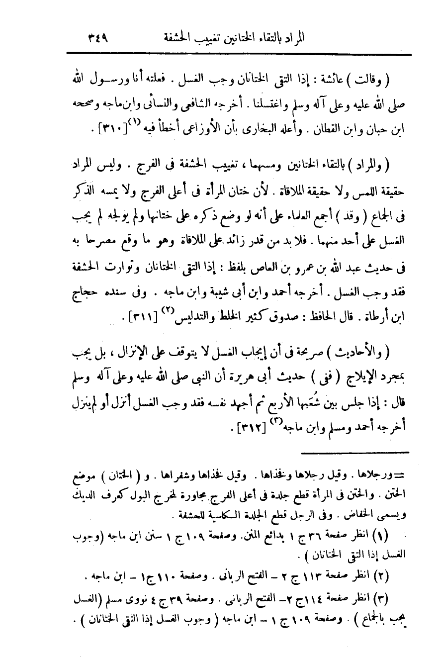 (¬3) انظر ص 114 ج 2 - الفتح الرباني. وص 39 ج 4 نووي مسلم (الغسل يجب بالجماع). وص 109 ج 1 - ابن ماجه (وجوب الغسل إذا التقى الختانان).
