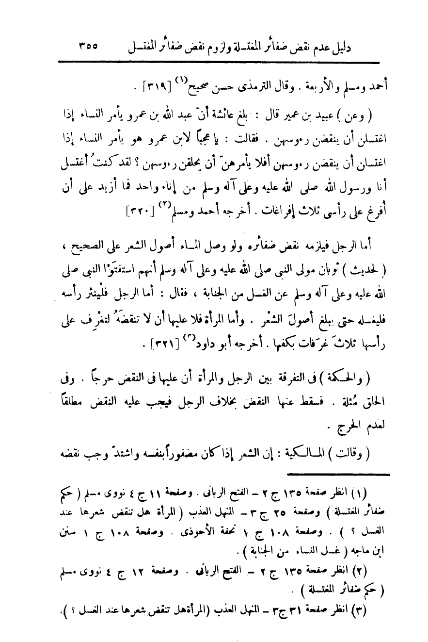 (¬1) انظر صفحة 135 ج 2 - الفتح الرباني. وصفحة 11 ج 4 نووي مسلم (حكم ضفائر المغتسلة) وصفحة 52 ج 3 - المنهل العذب (المرأة هل تنقض شعرها عند الغسل؟ ). وصفحة 108 ج 1 تحفة الأحوذي. وصفحة 108 ج 1 سنن ابن ماجه (غسل النساء من الجنابة).