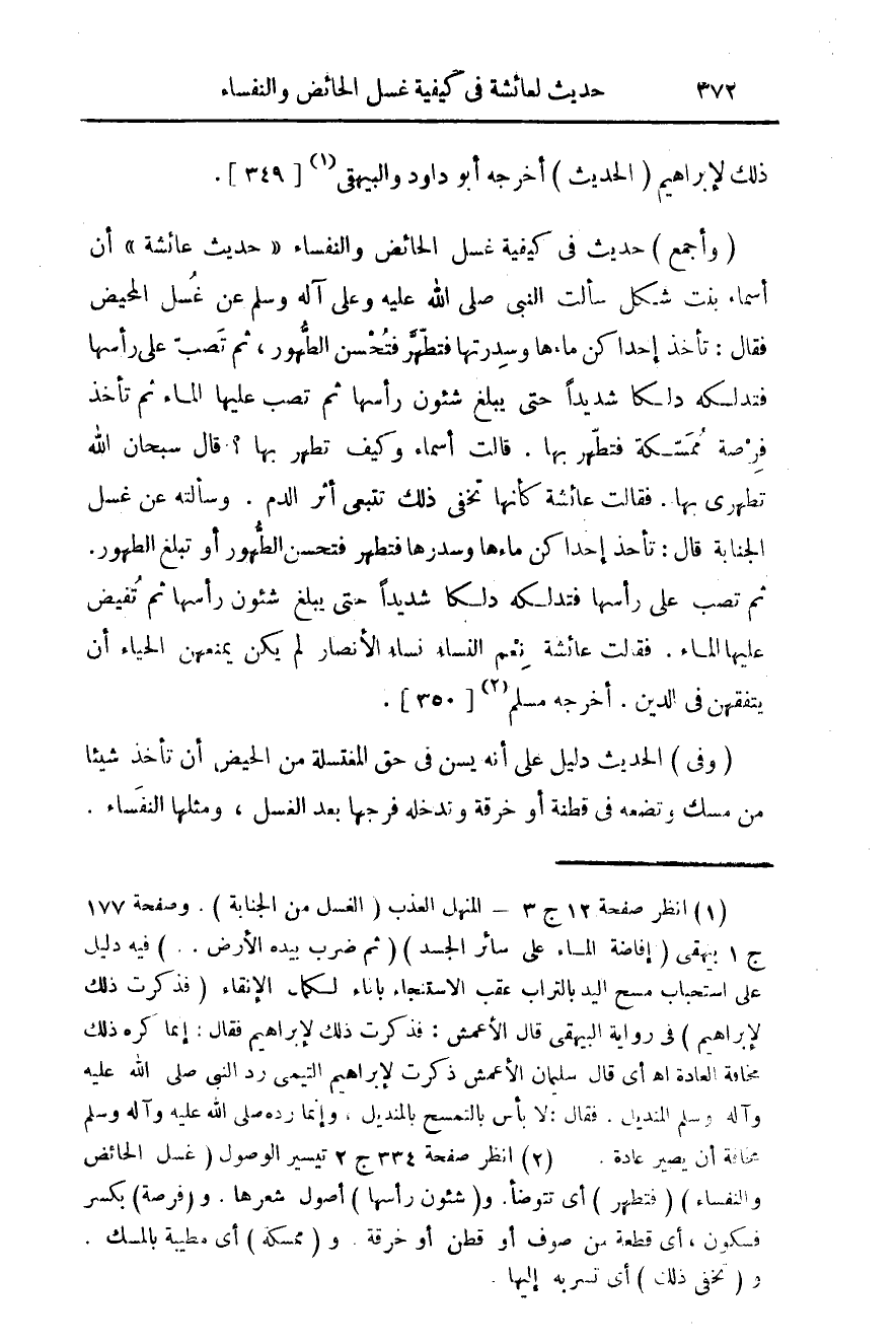 (¬2) انظر صفحة 334 ج 2 تيسير الوصول (غسل الحائض والنفساء) (فتطهر) أي تتوضأ. و (شئون رأسها) أصول شعرها. و (فرصة) بكسر فسكون، أي قطعة من صوف أو قطن أو خرقة. و (ممسكة) أي مطيبة بالمسك. و (تخفي ذلك) أي تسربه إليها.
