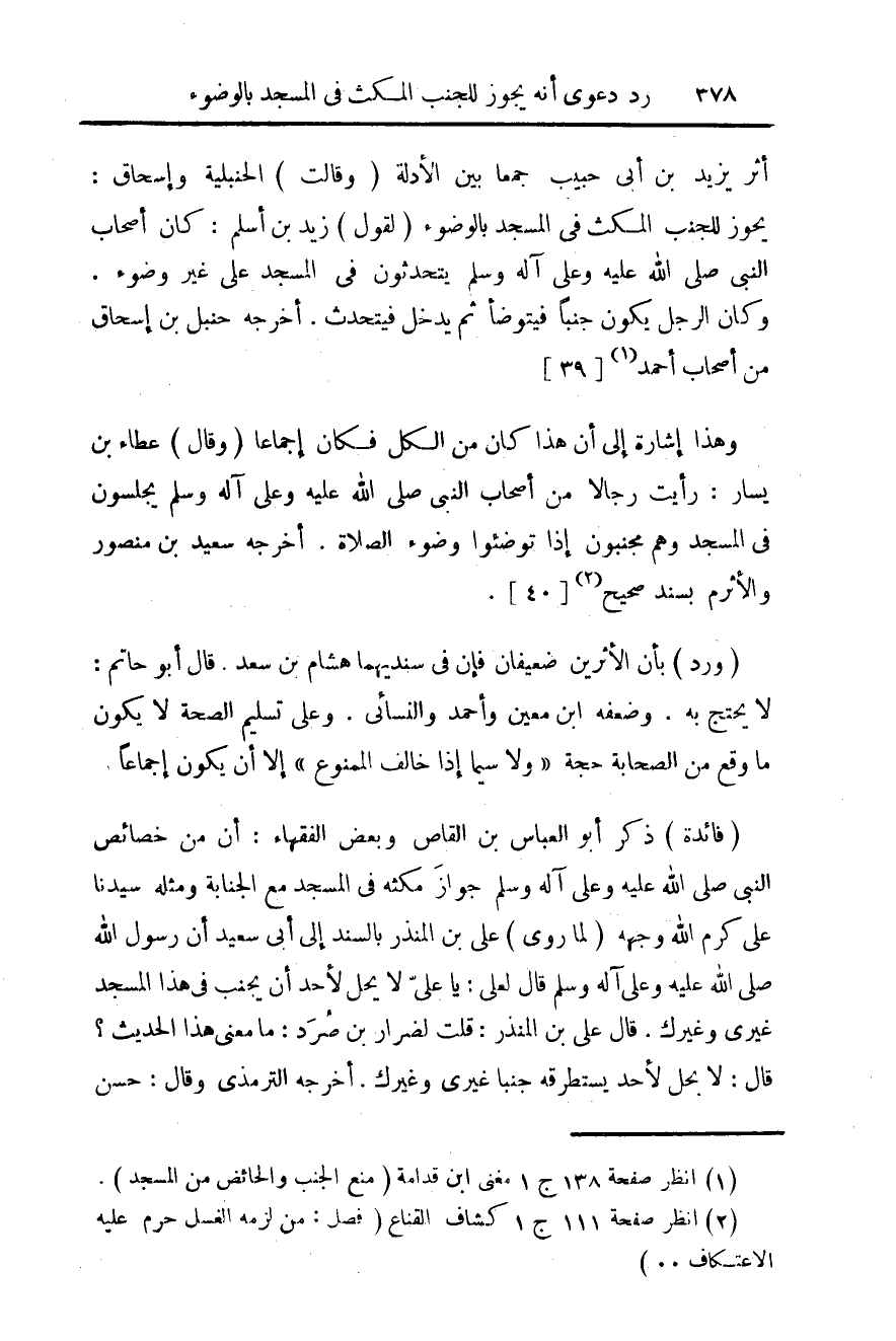 أثر يزيد بن ابي حبيب جمعاً بين الادلة (وقالت) الحنبلية واسحاق يجوز للجنب المكث في المسجد بالوضوء (لقول) زيد ابن اسلم: كان اصحاب النبي صلى الله عليه وعلى آله وسلم يتحدثون في المسجد على غير وضوء. وكان الرجل يكون جنباً فيتوضأ ثم يدخل فيتحدث. أخرجه حنبل بن اسحاق من أصحاب أحمد (¬1) {39}.