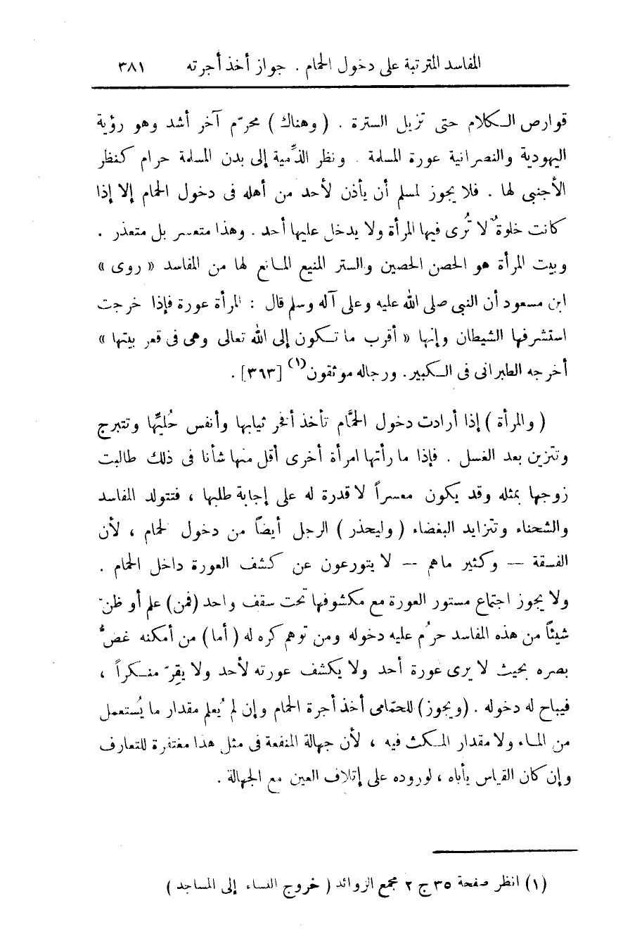 (والمرأة) إذا أرادت دخول الحمام تأخذ أفخر ثيابها وأنفس حليها وتتبرج وتتزين بعد الغسل. فإذا ما رأتها امرأة أخرى اقل منها شأناً في ذلك طالبت زوجها بمثله وقد يكون معسراً لا قدرة له على إجابة طلبها، فتتولد المفاسد والشحناء وتتزايد البغضاء (وليحذر) الرجل أيضاً من دخول الحمام، لأن الفسقة- وكثير ما هم- لا يتورعون عن كشف العورة داخل الحمام. ولا يجوز اجتماع مستور العورة مع مكشوفها تحت سقف واحد (فمن) علم أو ظن شيئاً من هذه المفاسد حرم عليه دخوله ومن توهم كره له (أما) من أمكنه غض بصره بحيث لا يرى عورة أحد ولا يكشف عورته لأحد ولا يقر منكراً، فيباح له دخوله. (ويجوز) للحمامي أخذ أجرة الحمام وان لم يعلم مقدار ما يستعمل من الماء ولا مقدار المكث فيه، لأن جهالة المنفعة في مثل هذا مغتفرة للتعارف وإن كان القياس يأباه، لوروده على إتلاف العين مع الجهالة.