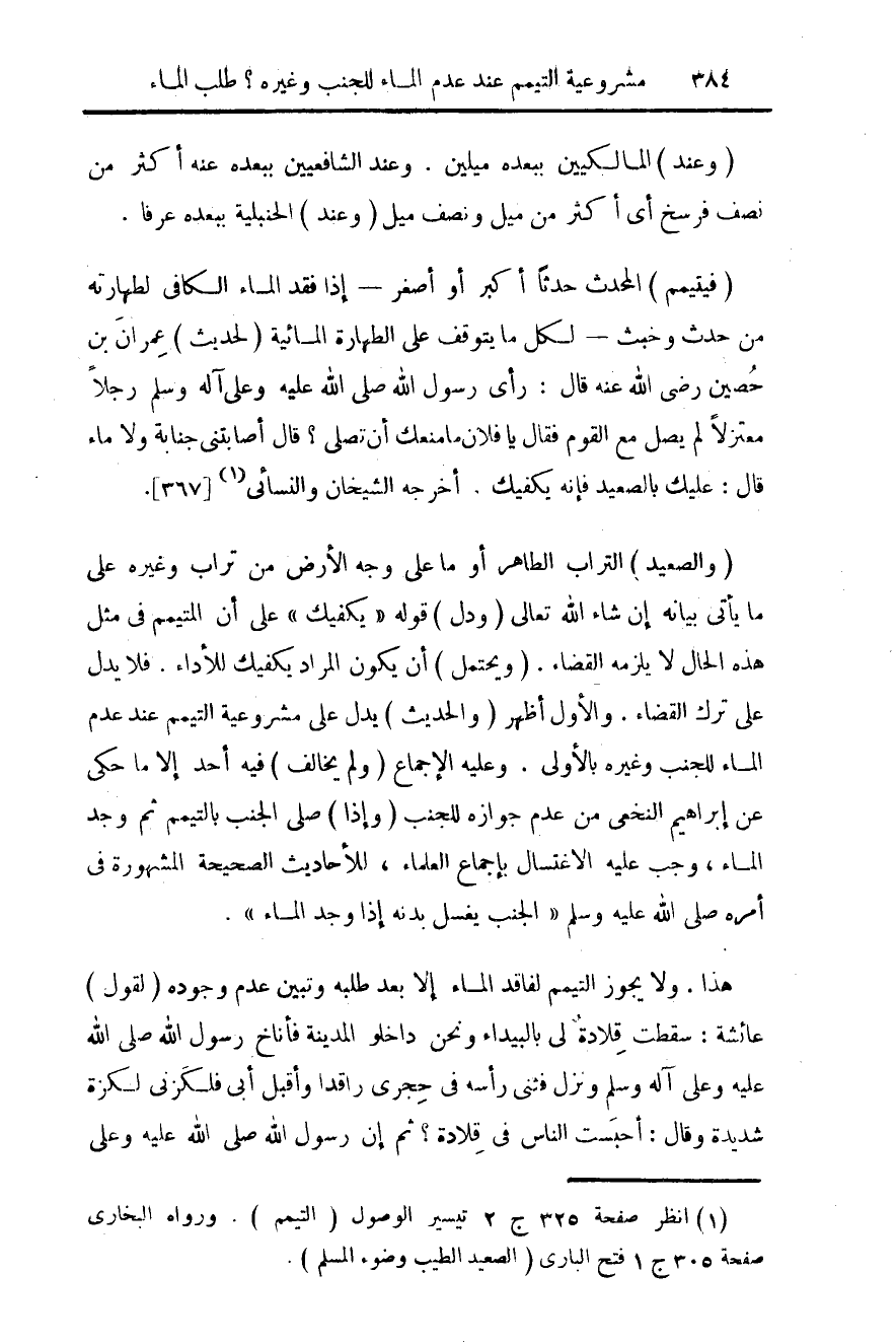 (فيتيمم) المحدث حدثاً أكبر أو اصغر - إذا فقد الماء الكافي لطهارته من حدث وخبث- لكل ما يتوقف على الطهارة المائية (لحديث) عمران بن حصين رضي الله عنه قال: رأى رسول الله صلى الله عليه وعلى آله وسلم رجلاً معتزلاً لم يصل مع القوم فقال يا فلان ما منعك أن تصلي؟ قال أصابتني جنابة ولا ماء قال. عليك بالصعيد فإنه يكفيك. أخرجه الشيخان والنسائي (¬1) {367}.
