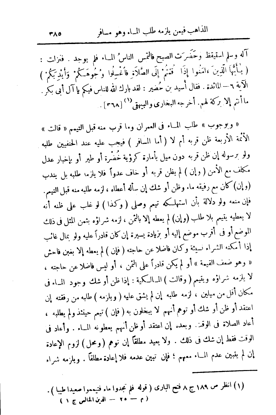 "وبوجوب" طلب الماء في العمران وما قرب منه قبل التيمم "قالت" الأئمة الأربعة ظن قربه ام لا (اما المسافر) فيجب عليه عند الحنفيين طلبه ولو برسوله ان ظن قربه دون ميل بإمارة كرؤية خضرة او طير او بأخبار عدل مكلف من الامن (وإن) كان مع رفيقه ماء وظن أو شك ان سأله أعطاه، لزمه طلبه منه قبل التيمم. فإن منعه ولو دلالة بأن استهلكه تيمم وصلى (وكذا) لو غلب على ظنه أنه لا يعطيه يتيمم بلا طلب (وإن) لم يعطه الا بالثمن، لزمه شراؤه بثمن المثل في ذلك الموضع او في أقرب موضع اليه او بزيادة يسيرة ان كان قادراً عليه ولو بمال غائب اذا امكنه الشراء نسيئه وكان فاضلاً عن حاجته (فإن) لم يعطه الا بغبن فاحش "وهو ضعف القيمة" او لم يكن قادراً على الثمن، او ليس فاضلاً عن حاجته، لا يلزمه شراؤه ويتيمم (وقالت) المالكية: اذا ظن او شك وجود الماء في مكان اقل من ميلين، لزمه طلبه ان لم يشق عليه (ويلزمه) طلبه من رفقته ان اعتقد او ظن او شك او توهم انهم لا يبخلون به (فإن) تيمم حينئذ ولم يطلبه، أعاد الصلاة في الوقت وبعده ان اعتقد او ظن انهم يعطونه الماء. وأعاد في الوقت فقط ان شك في ذلك. ولا يعيد مطلقاً ان توهم (ومحل) لزوم الاعادة ان لم يتبين عدم الماء معهم، فإن تبين عدمه فلا اعادة مطلقاً. ويلزمه شراء