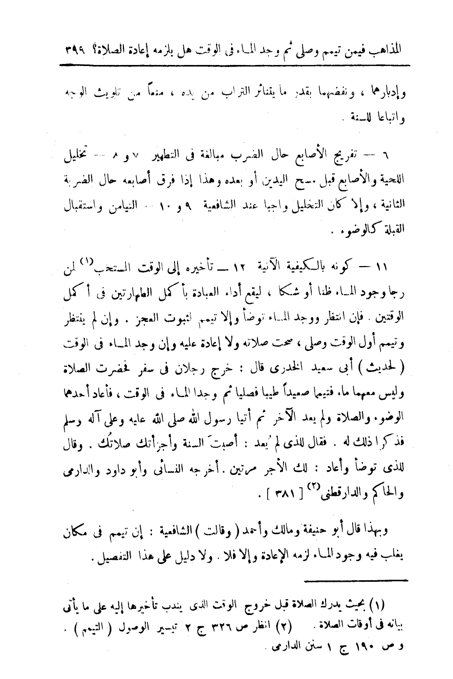 11 - كونه بالكيفية الآنية 12 - تأخيره إلى الوقت المستحب (¬1) لمن رجا وجود الماء ظناً أو شكاً، ليقع أداء العبادة بأكمل الطهارتين في أكمل الوقتين. فإن انتظر ووجد الماء توضأ وإلا تيمم لثبوت العجز. وإن لم ينتظر وتيمم أول الوقت وصلى، صحت صلاته ولا إعادة عليه وإن وجد الماء في الوقت (لحديث) أبي سعيد الخدري قال: خرج رجلان في سفر فحضرت الصلاة وليس معها ماء فتيمما صعيداً طيباً فصليا ثم وجدا الماء في الوقت، فأعاد أحدهما الوضوء والصلاة ولم يعد الآخر ثم أتيا رسول الله صلى الله عليه وعلى آله وسلم فذكرا ذلك له. فقال للذي لم يعد: أصبت السنة وأجزأتك صلاتك. وقال للذي توضأ وأعاد: لك الأجر مرتين. أخرجه النسائي وأبو داود والدارمي والحاكم والدارقطني (¬2) {381}.