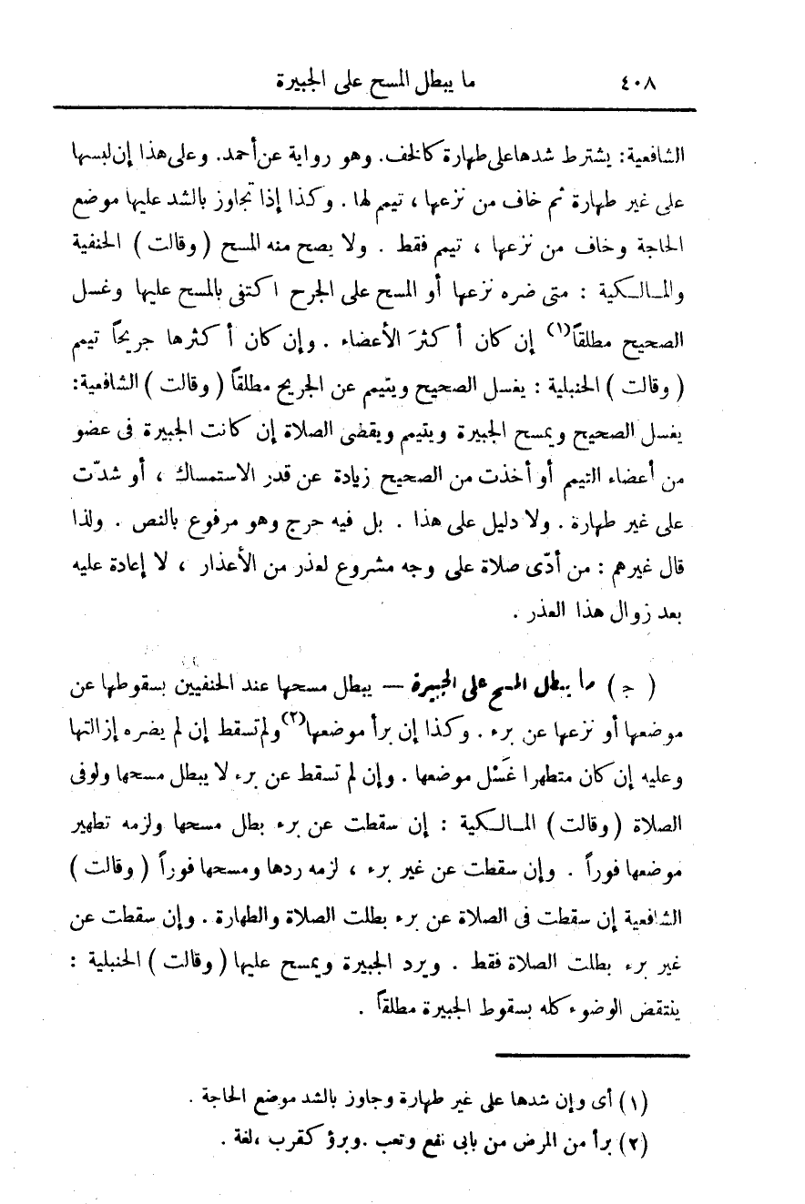 الشافعية: يشترط شدها على طهارة كالخف. وهو رواية عن أحمد. وعلى هذا ان لبسها على غير طهارة ثم خاف من نزعها، تيمم لها. وكذا اذا تجاوز بالشد عليها موضع الحاجة وخاف من نزعها، تيمم فقط. ولا يصح منه المسح (وقالت) الحنفية والمالكية: متى ضره نزعها أو المسح على الجرح اكتفى بالمسح عليها وغسل الصحيح مطلقاً (¬1) ان كان اكثر الأعضاء، وان كان أكثرها جريحاً تيمم. (وقالت) الحنبلية: يغسل الصحيح ويتيمم عن الجريح مطلقاً (وقالت) الشافعية: يغسل الصحيح ويمسح الجبيرة ويتيمم ويقضي الصلاة إن كانت الجبيرة في عضو من أعضاء التيمم او أخذت من الصحيح زيادة قدر الاستمساك، أو شدت على غير طهارة. ولا دليل على هذا. بل فيه حرج وهو مرفوع بالنص. ولذا قال غيرهم: من أدى صلاة على وجه مشروع لعذر من الأعذار، لا إعادة عليه بعد زوال هذا العذر.