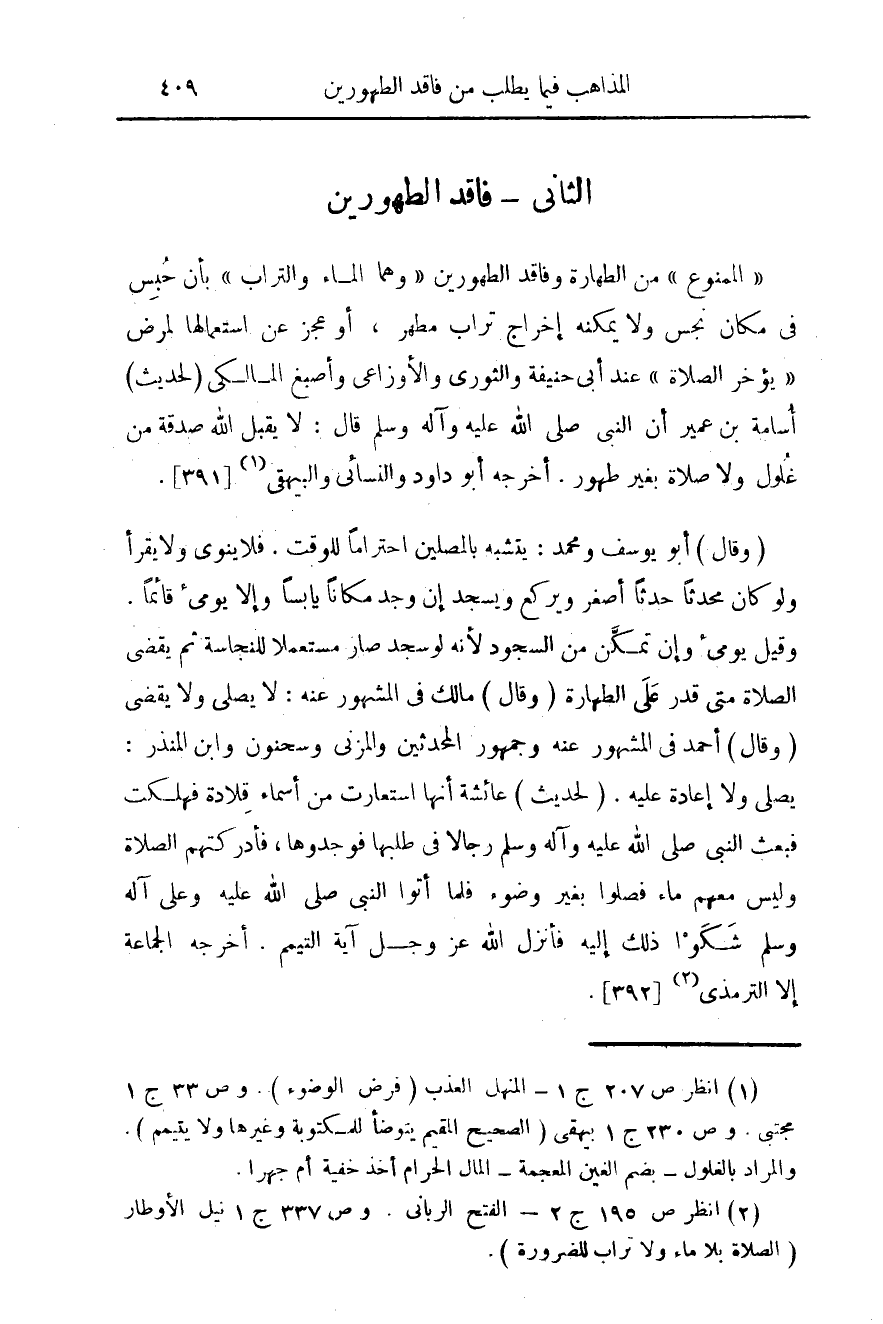 (¬2) انظر ص 195 ج 2 - الفتح الرباني. وص 337 ج 1 نيل الاوطار (الصلاة بلا ماء ولا تراب للضرورة).