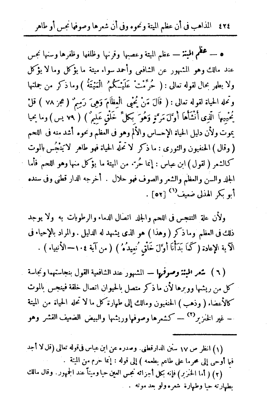 5 - عظم الميتة - عظم الميتة وعصبها وقرنها وظلفها وظفرها وسنها نجس عند مالك وهو المشهور عن الشافعي وأحمد سواء ميتة ما يؤكل وما لا يؤكل ولا يطهر بحال لقوله تعالى: (حرمت عليكم الميتة) وما ذكر من جملتها وتحله الحياة لقوله تعالى: (قال من يحيي العظام وهي رميم (عجز 78) (قل يحييها الذي أنشأها أول مرة وهو بكل خلق عليم) (79 يس) وما يحيا يموت ولأن دليل الحياة الإحساس والألم وهو في العظم ونحوه أشد منه في اللحم (وقال) الحنفيون والثوري: ما ذكر لا تحله الحياة فهو طاهر لا ينجس بالموت كالشعر (لقول) ابن عباس: إنما حرم من الميتة ما يؤكل منها وهو اللحم فأما الجلد والسن والعظم والشعر والصوف فهو حلال. أخرجه الدارقطني وفي سنده أبو بكر الهذلي ضعيف (¬1) {52}.