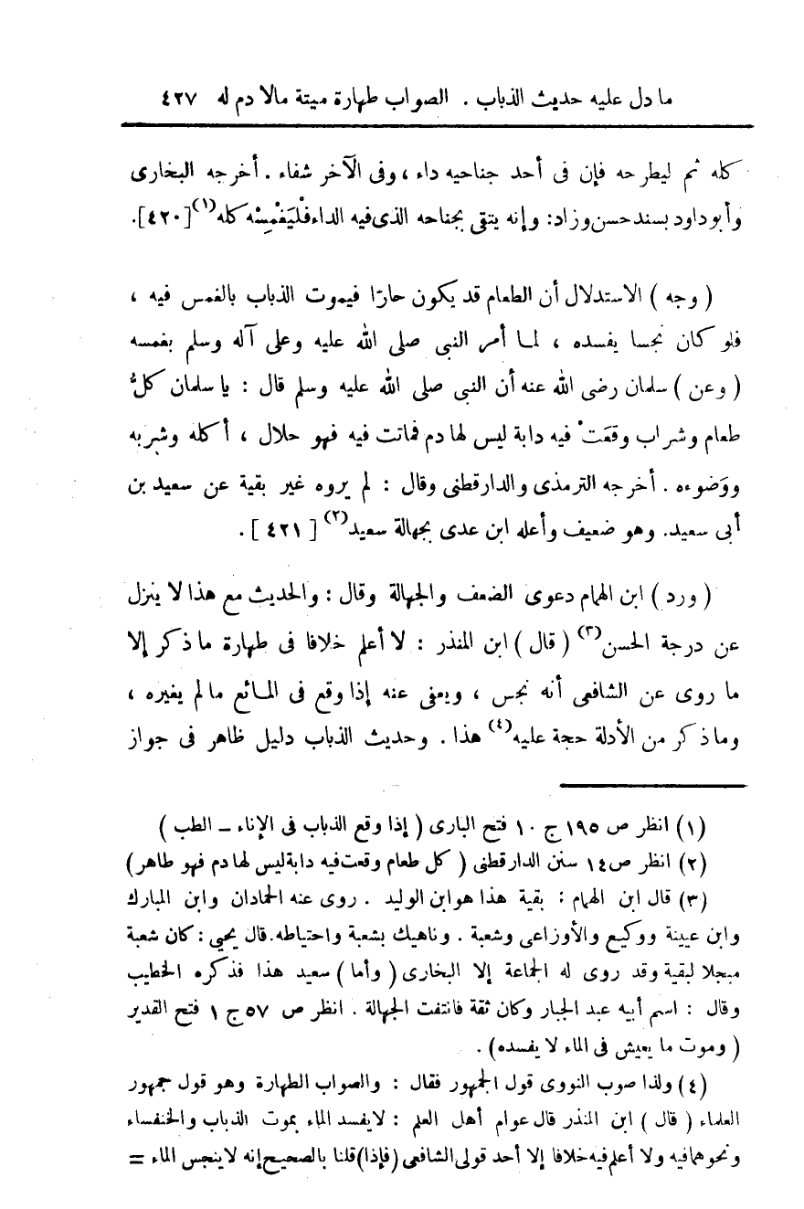 (وجه) الاستدلال ان الطعام قد يكون حاراً فيموت الذباب بالغمس فيه، فلو كان نجساً يفسده، لما أمر النبي صلى الله عليه وعلى آله وسلم بغمسه (وعن) سلمان رضي الله عنه ان النبي صلى الله عليه وسلم قال: يا سلمان كل طعام وشراب وقعت فيه دابة ليس لها دم فماتت فيه فهو حلال، أكله وشربه ووضوءه. أخرجه الترمذي والدارقطني وقال: لم يروه غير بقية عن سعيد بن أبي سعيد. وهو ضعيف وأعله ابن عدي بجهالة سعيد (¬2) {421}.