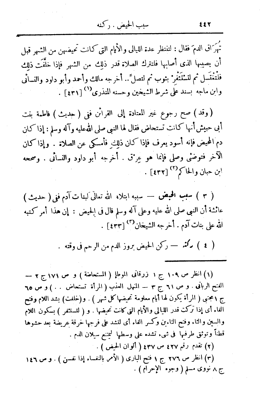 (¬1) انظر ص 109 ج 1 زرقاني الموطا (المستحاضة) وص 171 ج 2 - الفتح الرباني. وص 61 ج 3 - المنهل العذب (المرأة تستحاض .. ) وص 65 ج 1 مجتبي (المرأة يكون لها أيام معلومة تحيضها كل شهر). و (خلفت) بشد اللام وفتح الفاء أي إذا تركت قدر الليالي والأيام التي كانت تحيضها. و (لتستفر) بسكون اللام والسين والثاء وفتح التاءين وكسر الفاء أي لتشد على فرجها خرقة عريضة بعد حشوها قطناً وتوثق طرفيها في شيء تشده على وسطها ليمتنع سيلان الدم.