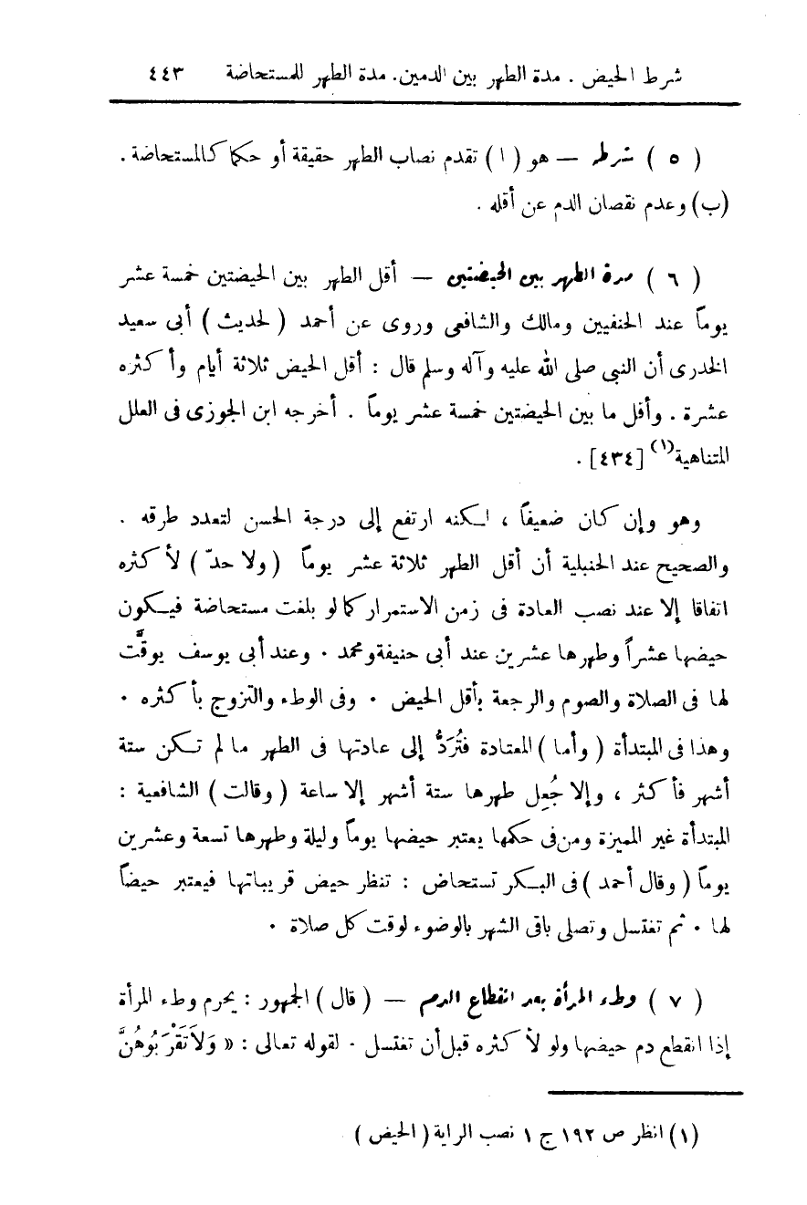 6 - مدة الطهر بين الحيضتين: أقل الطهر بين الحيضتين خمسة عشر يوماً عند الحنفيين ومالك والشافعي وروي عن أحمد (لحديث) أبي سعيد الخدري أن النبي صلى الله عليه وآله وسلم قال: أقل الحيض ثلاثة أيام وأكثره عشرة. وأقل ما بين الحيضتين خمسة عشر يوماً. أخرجه ابن الجوزي في العلل المتناهية (¬1) {434}.