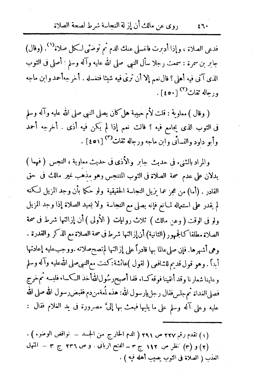 (¬2) انظر ص 112 ج 3 - الفتح الرباني. وص 236 ج 3 - المنهل العذب (الصلاة في الثوب يصيب أهله فيه).