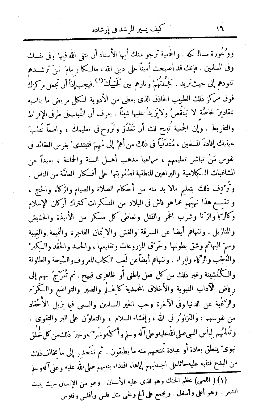 ووعورة مسالكه. والجمعية ترجو منك أيها الأستاذ أن تتقى الله فيها وفى نفسك وفى المسلمين. فانك قد أصبحت أمينا على دين الله، مالكا زمام من ترشدهم تقودهم إلى حيث تريد. فجنتهم ونارهم بين لحييك (¬1). فيجب إذا أن تجعل مركزك فوق مركز ذلك الطبيب الحاذق الذى يعطى من الأدوية لكل مريض ما يناسبه بمقادير خاصة لا ينقص ولا يزيد عليها شيئا. يعرف أن التباب فى طرفى الإفراط والتفريط. وان الجمعية تبيح لك أن تغدو وتروح فى تعليمك، واضعا نصب عينيك إفادة المسلمين، متدليا فى ذلك من أهم إلى مهم فتبتدئ بغرس العقائد فى نفوس من تباشر تعليمهم، مراعيا مذهب أهل السنة والجماعة، بعيدا عن المشاغبات الكلامية والبراهين المنطقية لصعوبتها على أفكار العامة من الناس. وتردف ذلك بتعليم ما لابد منه أحكام الصلاة والصيام والزكاة والحج، وتتبع هذا نهيهم عما هو فاش فى البلاد من المنكرات كترك أركان الإسلام وكالربا والزنا وشرب الخمر والقتل وتعاطى كل مسكر من الأنبذة والحشيش والمنازيل. وتنهاهم أيضا عن السرقة والغش والإيمان الفاجرة والنميمة والغيبة وسم البهائم وشق بطونها وحرق المزروعات وتقليعها، والحسد والحقد والكبر والعجب والرياء والمراء.