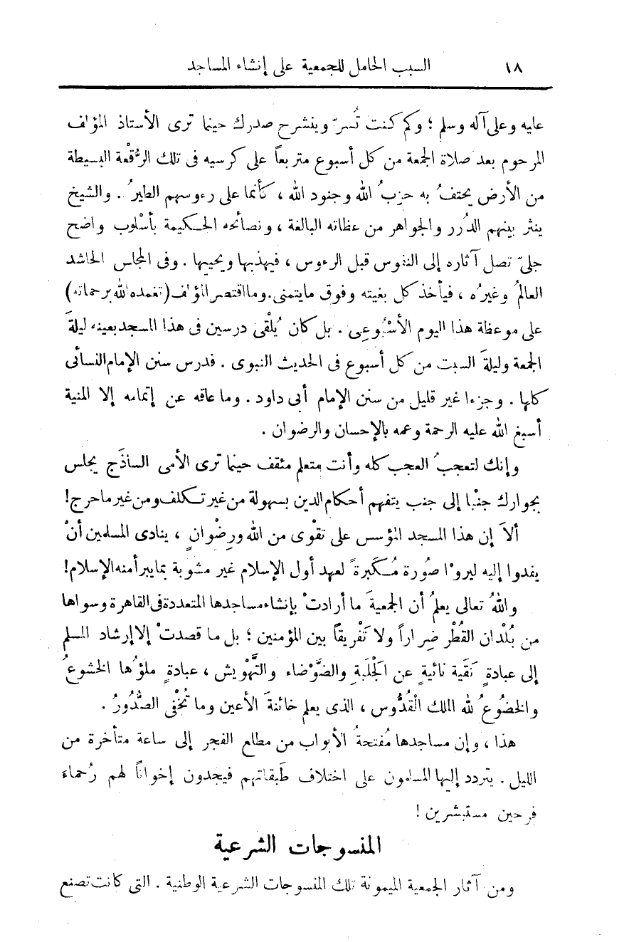 والله تعالى يعلم أن الجمعية ما أرادت بإنشاء مساجدها المتعددة فى القاهرة وسواها من بلدان القطر ضرارا ولا تفريقا بين المؤمنين، بل ما قصدت إلا إرشاد المسلم إلى عبادة نقية نائية عن الجلبة والضوضاء والتهويش، عبادة ملؤها الخشوع والخضوع لله الملك الدوس، الذى يعلم خائنه الأعين وما تخفى الصدور.