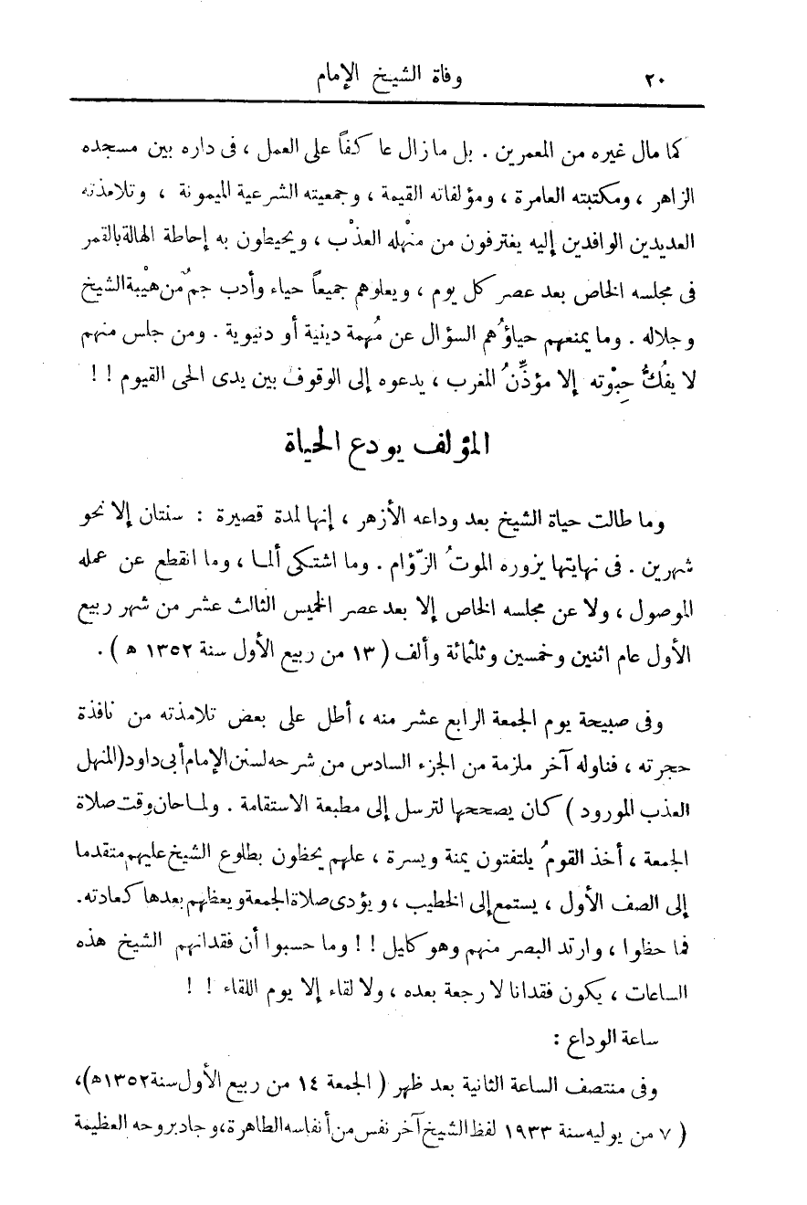 وما طالت حياة الشيخ بعد وداعه الأزهر، إنها لمدة قصيرة: سنتان إلا نحو شهرين. فى نهايتها يزوره الموت الزوام. وما اشتكى ألما، وما انقطع عن عمله الموصول، ولا عن مجلسه الخاص إلا بعد عصر الخميس الثالث عشر من شهر ربيع الأول عام اثنين وخمسين وثلاثمائة وألف (13 من ربيع الأول سنة 135 هـ)