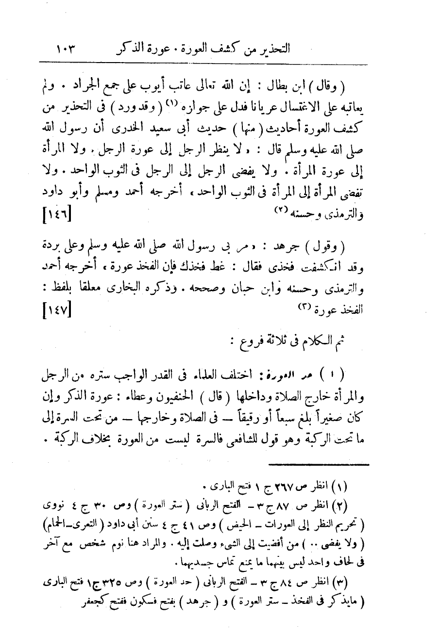(وقول) جَرْهَدٍ: " مر بى رسول الله صلى الله عليه وسلم وعلىّ بُردة وقد انكشفَتْ فخذِى فقال: غطّ فخذك فإن الفخذ عورة " أخرجه أحمد والترمذى وحسنه وابن حبان وصححه. وذكره البخارى معلقا بلفظ: الفخذ عورة (¬3) {147}