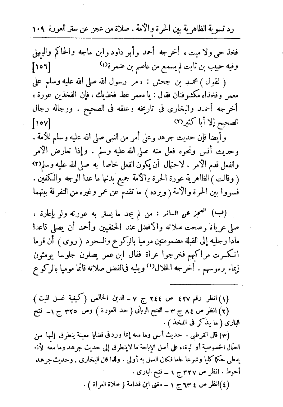 (لقول) محمد بن جحش: " مرّ رسول الله صلى الله عليه وسلم على مَعْمَر وفخذاه مكشوفتان فقال: يا معمرُ غِّط فخذيك، فإن الفخذين عورة " أخرجه أحمد والبخارى فى تاريخه وعلقه فى الصحيح. ورجاله رجال الصحيح إلا أبا كثير (¬2) {157}