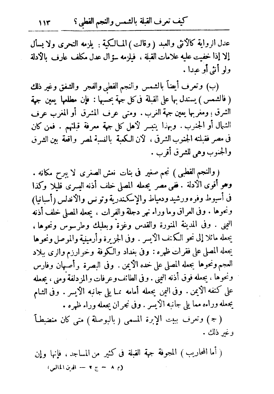 عدل الرواية كالأنثى والعبد (وقالت) المالكية: يلزمه التحرى ولا يسأل إلا إذا خفيت عليه علامات القبلة، فيلزمه سؤال عدل مكلف عارف بالأدلة ولو أنثى أو عبدا (ب) وتعرف أيضاً بالشمس والنجم القطبى والفجر والشفق وغير ذلك (فالشمس) يستدل بها على القبلة فى كل جهة بحسبها: فإن مطلعا يُعَيِّن جهة الشرق، ومغربها يعين جهة الغرب. ومتى عُرِف المشرف أو المغرب عُرِف الشمال أو الجنوب. وبهذا يتيسر لأهل كل جهة معرفة قبلتهم. فمن كان فى مصر فقبلته الجنوب الشرقى، لأن الكعبة بالنسبة لمصر واقعة بين الشرق والجنوب وهى للشرق أقرب.