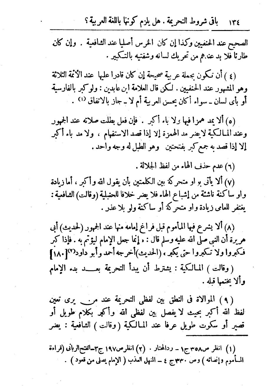 (8) ألاّ يشرع فيها المأموم قبل فراغ إمامه منها عند الجمهور (لحديث) أبى هريرة أنّ النبى صلى الله عليه وسلم قال: " إنما جّعِل الإمامُ لِيؤتمّ به. فإذا كبر فكبروا ولا تكبروا حتى يكبر " (الحديث) أخرجه أحمد وأبو داود (¬2) {180}