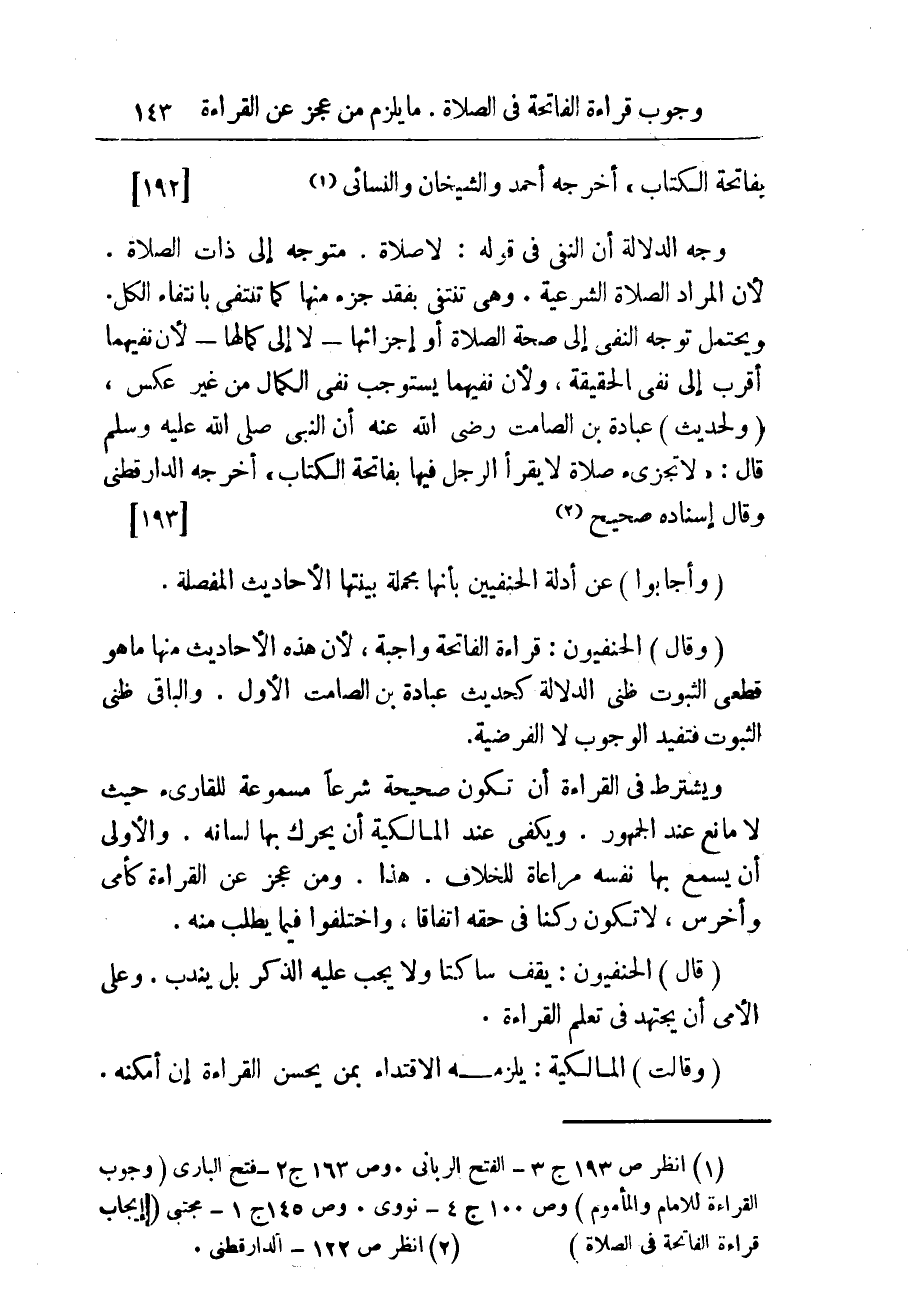 (¬1) ص 193 ج 3 - الفتج الربانى. وص 163 ج 2 - فتح البارى (وجوب القراءة للإمام والمأموم). وص 100 ج 4 - نووى. وص 145 ج 1 - مجتبى (إيجاب قراءة الفاتحة فى الصلاة).
