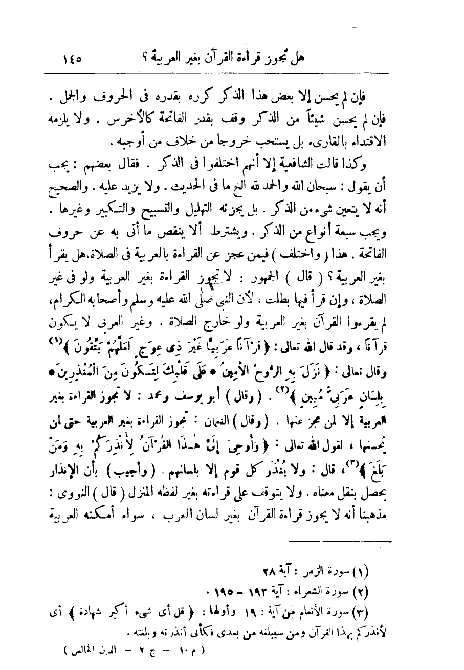 وكذا قالت الشافعية إلا أنهم اختلفوا فى الذكر. فقال بعضهم: يجب ان يقول: سبحان الله والحمد لله الخ ما فى الحديث. ولا يزيد عليه. والصحيح أنه لا يتعين شئ من الذكر. بل يِجزئه التهليل والتسبيح والتكبير وغيرها. ويجب سبعة أنواع من الذكر. ويشترط ألاّ ينقص ما أتى به عن حروف الفاتحة. هذا (واختلف) فيمن عجز عن القراءة بالعربية فى الصلاة، هل يقرأ بغير العربية؟ (قال) الجمهور: لا تجوز القراءة بغير العربية ولو فى غير الصلاة. وإن قرأ فيها بطلت، لأن النبى صلى الله عليه وسلم وأصحابه الكرام، لم يقرءوا القرآن بغير العربية ولو خارج الصلاة. وغير العربىّ لا يكون قرآنا. وقد قال تعالى: {قُرْآناً عَرَبِياًّ غَيْرَ ذِي عِوَجٍ لَّعَلَّهُمْ يَتَّقُونَ (¬1)} وقال تعالى: {نَزَلَ بِهِ الرُّوحُ الأَمِينُ. عَلَى قَلْبِكَ لِتَكُونَ مِنَ المُنذِرِينَ. بِلِسَانٍ عَرَبِيٍّ مُّبِينٍ (¬2)} (وقال) النعمان: تجوز القراءة بغير العربية حتى لمن يُحسنها، لقول الله تعالى: {وَأُوحِيَ إِلَيَّ هَذَا القُرْآنُ لأُنذِرَكُم بِهِ وَمَن بَلَغَ (¬3)} قال: ولا يُنْذّركم قوم إلا بلسانهم (وأجيب) بأن الإنذار يحصل بنقل معناه. ولا يتوقف على قراءته بغير لفظة المنزل (قال) النووى: مذهبنا أنه لا يجوز قراءة القرآن بغير لسان العرب، سواء أمكنه العربية